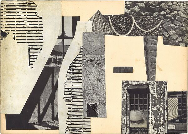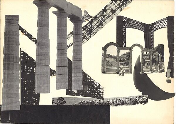 前者のうち典型的なのがcat.no.4の作品である。垂直と水平、そして斜め45°の形態の組み合わせによって画面全体の構築性が明確に意識されている。そして、古代ギリシア・ローマの円柱のイメージと、近代的な鉄骨建築のイメージが重ね合わされている点にも注意したい。これらのイメージは新旧の対比であると同時に、オザンファンとジャンヌレ(ル・コルビュジエ)が、『エスプリ・ヌーヴォー』誌上で試みたような、数学的秩序によって古典と近代に共通の美を認めようとする態度をも想起させる。同様の対比はcat.no.6の作品にも認められるが、こちらではさらに流行の衣装をまとう女性のイメージが組み合わされており、ここでの女性はその容貌が解体されていない。いわば、黒い台紙を用いた彼のフォト・コラージュとは正反対の性質をもつ作品といってよい。