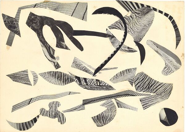 一方、cat.nos.3, 10, 11の作品では、切り抜かれた個々のイメージはひじょうに断片的であり、もともと何のイメージだったかわかりにくい。cat.no.3 の作品における縞模様のイメージは、その一部にスキーヤーの姿をかろうじて認めることができるので、雪山の写真を切り抜いたものとわかるが、あまりに細分化されているため、雪山という意味を失い、同じ画面内に配されている網目のイメージとほぼ等価の、単なる模様としての効果を求められるのみの存在となっている。そして、個々のイメージがあまりに断片化され、画面内にオール・オーヴァーに貼り付けられているため(とくにcat.no.10は中心から四方にイメージが放射状に散らばるように配置されている)、作品の天地がはっきりしない(5)。現在採用されている画面の向きはあくまで暫定的なものだ。