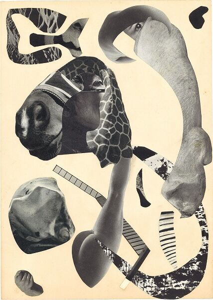 以上に確認したような、cat.no.1のフォト・コラージュや、第1回自由美術家協会展に発表された《レアル》連作が、いずれも反理知的性格を強く有しているのに対して、このたび新たに発見されたコラージュの多くは大きくその性質を異にしているようにみえる。上述のcat.no.1を除くと、台紙は暗闇を表す黒ではなく、ニュートラルな白である。そして構成の仕方に、大きく分けて2つの傾向が認められる。ひとつは個々のイメージがはっきり何であるかがわかりやすく、それらを画面上にどのように構成するかに意が注がれているもの(cat.nos.2, 4, 5, 6, 7, 8)、そしてもうひとつは、個々のイメージがより断片的であり、それらが画面上にオール・オーヴァーに散りばめられているもの(cat.nos.3, 10, 11)である。cat.no.9は両者の中間に位置づけられるようにみえる。