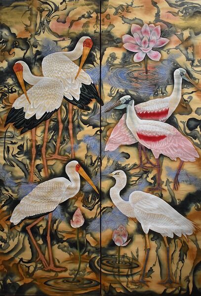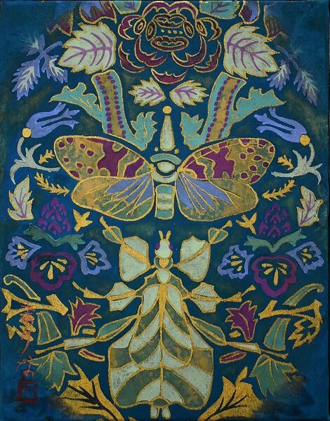 絹本着彩・パネル・絹・岩絵具・水干絵具・墨