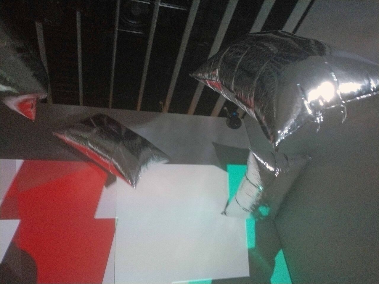 その奥は1966年のレオ・キャステリ画廊の個展で発表されたというインスタレーション「銀の雲」の部屋。人工的な気流のなかで、大きな枕のような形の「雲」がゆったりと漂う仕掛け(図29)。童心に還って、天井に向って投げたり、バレーボールのトスのように放り上げたりしていると、気持ちが楽になってくる。