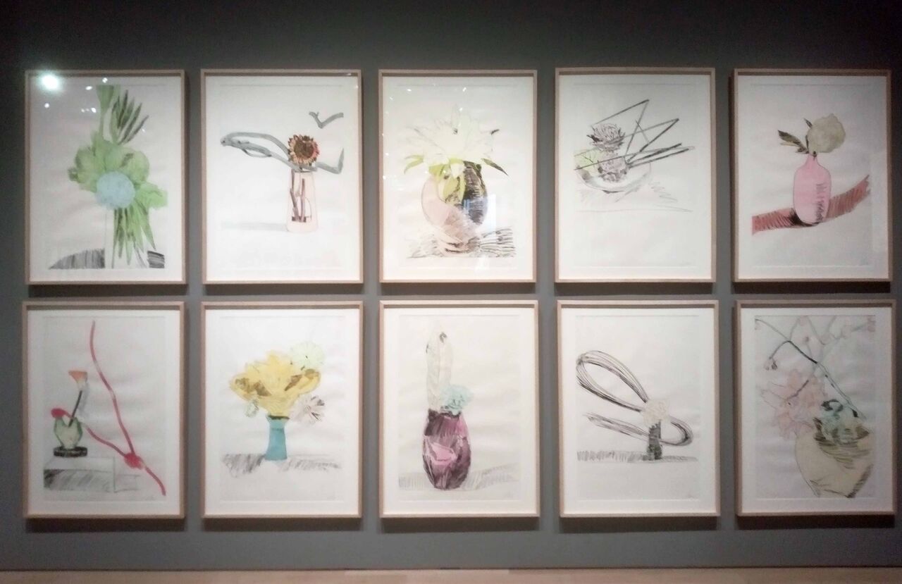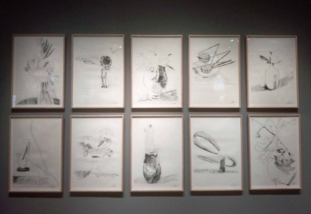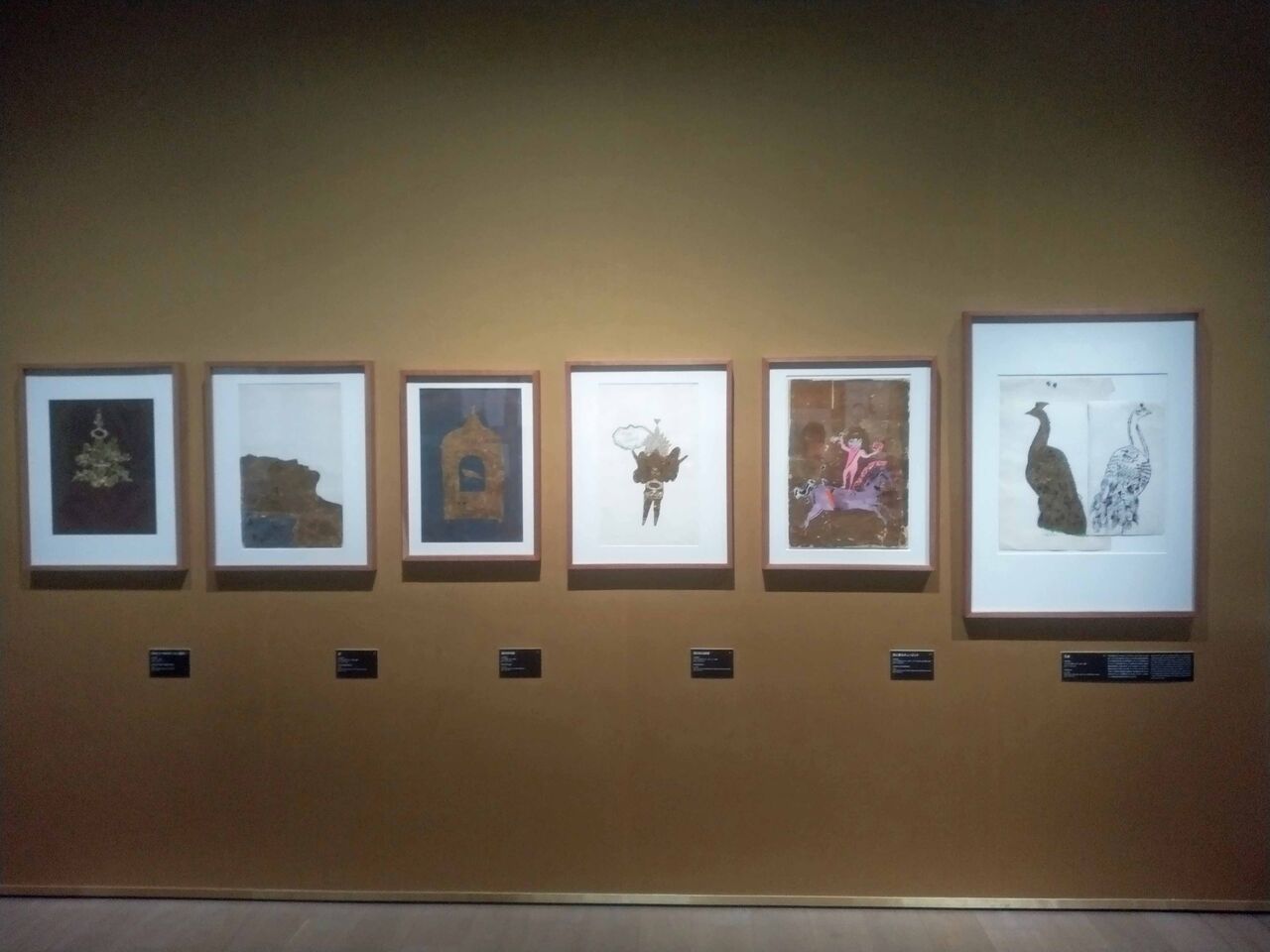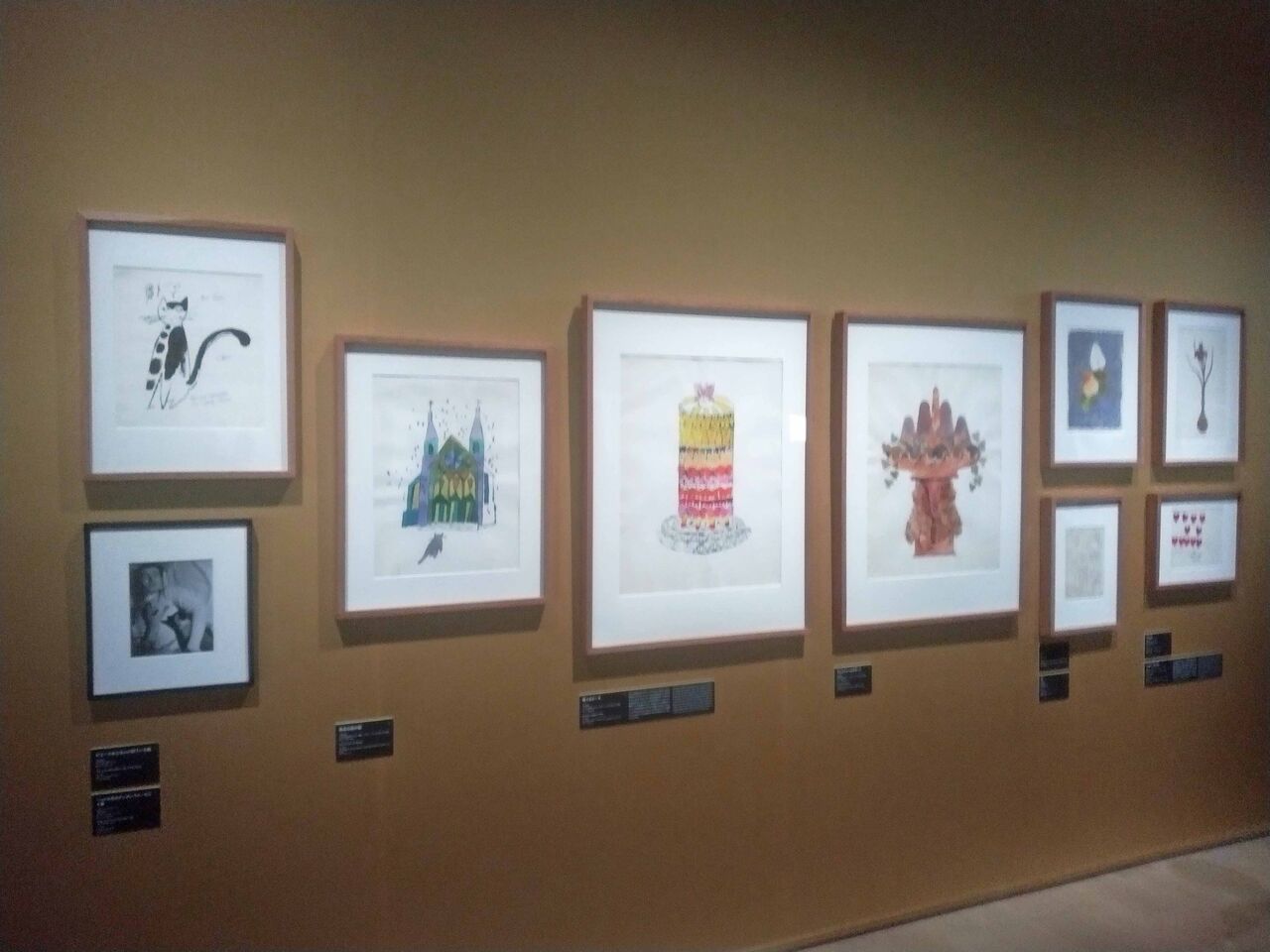 最初のコーナーは初期のドローイングや金箔のコラージュ、立体など(図10)。ドローイングは、対象の再現にはこだわらず、商業イラストレーターらしく、鋭くはないが達者で味わいがある輪郭線と密集した線描の、2つの要素だけで対象の特徴を捉えている。彩色されたイラストは、そのまま後年のシルクスクリーン作品に繋がるように思えた。