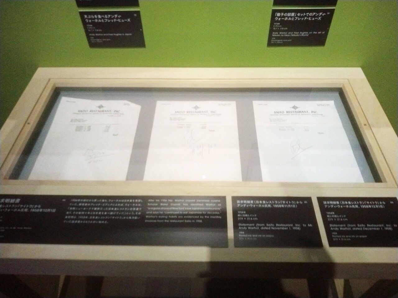 ウォーホルが日本贔屓だったのは間違いないらしく、実際、当時はニューヨークに数軒しかなかった日本食レストランの常連となり、生け花などの日本文化にも関心を持ち続けていたそうだ。日本食レストランからの毎月の請求書や生け花の資料なども展示されていた(図23,24)。こういう事実や人となりを初めて知り、今までのウォーホル嫌いは何処へやら、こちらもすっかりウォーホルに好意を持ってしまった。