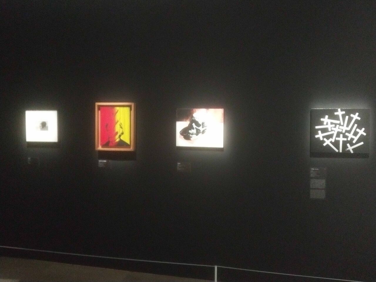 さらに左手には迷彩色に塗られた「自由の女神」(図44)。制昨年は1986年で、ベトナム戦争批判などの政治的な意味合いはないようだ。その左手の壁には迷彩色によるオールオーバーの巨大な作品「カモフラージュ」(図45)。後ろ側には「影」と題された作品も展示されている(図46)。解説によると、ウォーホルは常日頃、光と影のコントラストに惹かれていたそうで、これらの抽象的な作品は光と影の効果が探求されているようだが、拝見していて、正直、あまり面白くなかった。