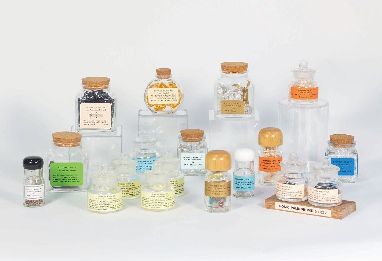 幣ギャラリーから提供している塩見允枝子《音楽の小瓶"1~#14》は、1993年にケルンのフルデルトマルク画廊が主催した「サウンド・オブジェクト展」のために制作したシリーズ作品で、様々な音楽的コンセプトが小瓶の中に詰められています。