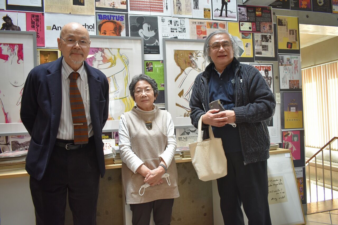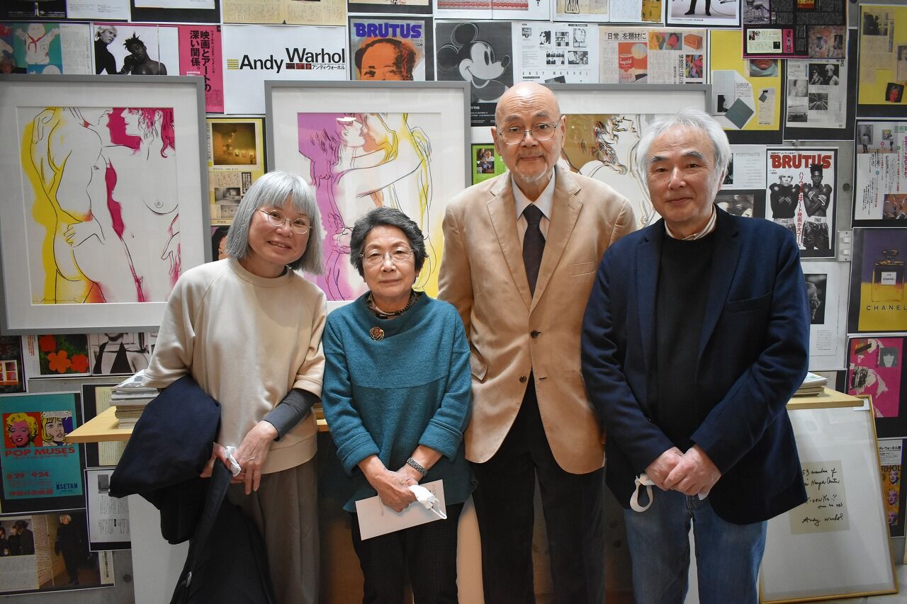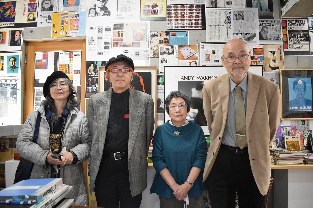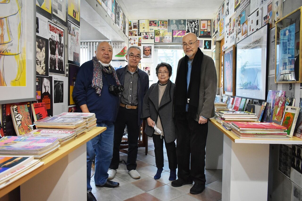展示20 まったくの偶然ですが(いや宿命かもしれません)、下記tajiriayakoさんが来廊された数日後に、高田馬場で私設図書館・六月社を主宰していた橋本凌一さん(中央)がひょっこり来廊されました。現代版画センターの創立メンバーにして名付け親です。<駒込のギャラリー「ときの忘れもの」にて、「アンディ・ウォーホル展 史上最強!ウォーホルの元祖オタク栗山豊が蒐めたもの」。壁にびっしりと貼られたチラシや雑誌の切り抜き、ポスターから、80~90年代のアート、デザインの熱量が立ち上ってくる。大量の記事が収められたスクラップをめくっていたら、初めて高田馬場の六月社に行った時に圧倒された感じを思い出した。