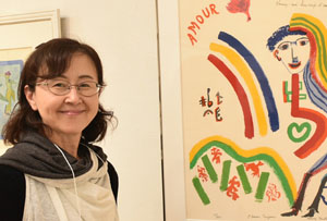 靉嘔「Rainbow landscape lithgraph A」の前で。秀坂令子さんは久保先生の秘書をつとめ、会場となったストライプハウスギャラリーの初期スタッフでもあります。秀坂さんのエッセイ「久保貞次郎先生の思い出」は10月8日のブログに掲載しました。