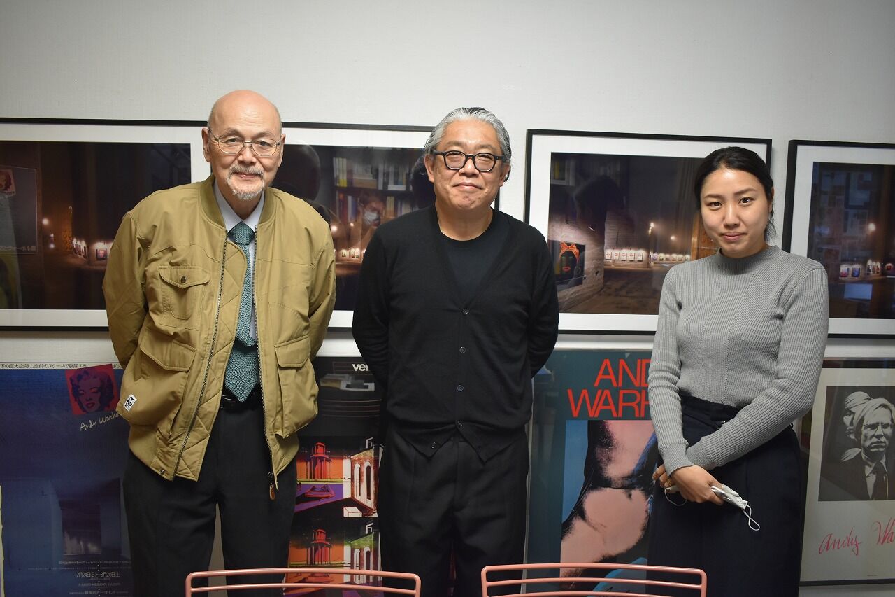 展示22 左から石田了一版画工房の大谷京子さん、社長、亭主、石田了一さん。バックは石田さんが刷ったウォーホルの「LOVE」連作。