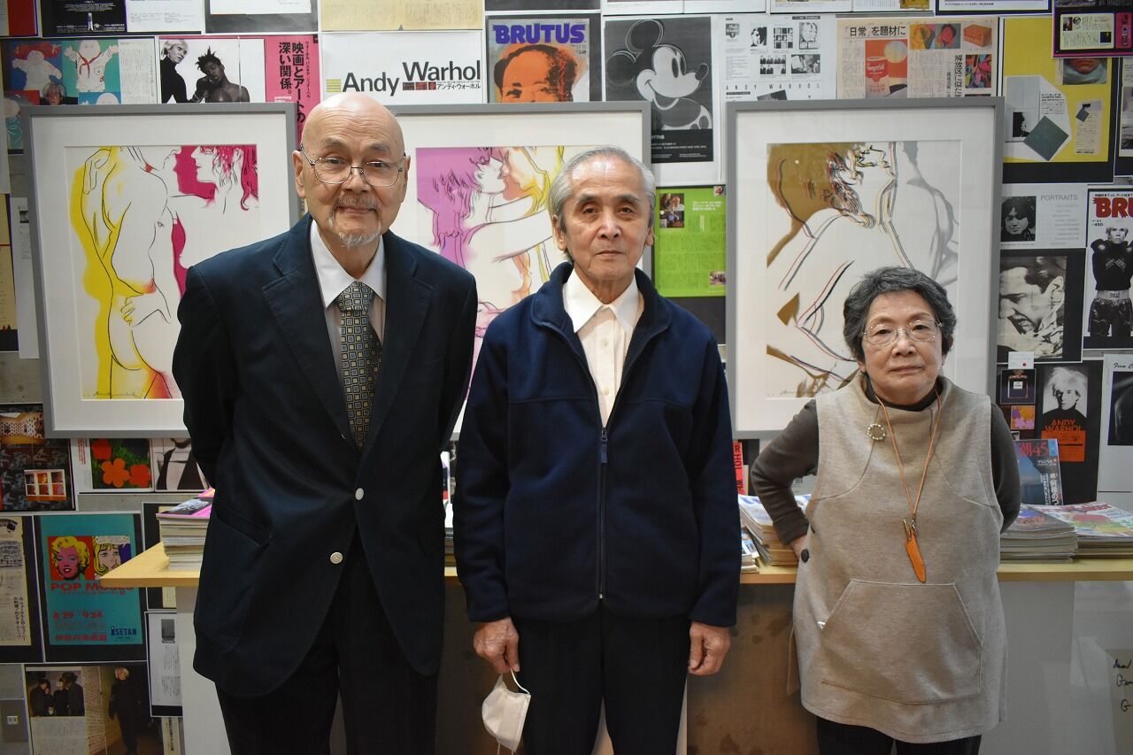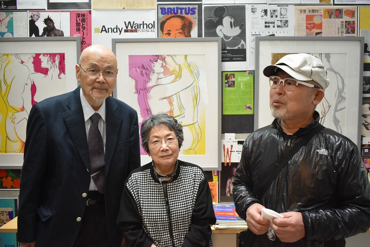 展示22 左から石田了一版画工房の大谷京子さん、社長、亭主、石田了一さん。バックは石田さんが刷ったウォーホルの「LOVE」連作。1983年7月23日「巨大地下空間とウォーホル展」オープニング映像+α