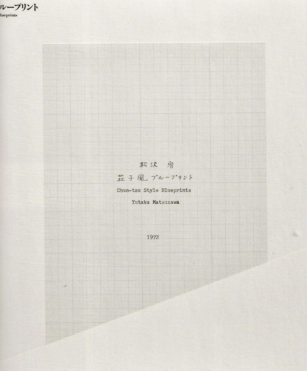 今から40年程前に遡るが、造形社から刊行された『Ψの函』(限定350部1983年7月刊)を持っていた。今は手放してしまったのが惜しまれるが、総括的な作品集として編まれたもので、黒い布装の夫婦函に一枚毎に印刷された72葉の作品が9葉ずつ八つのパートに分けた黒い帙に入れて収納されていた。(この仕様はデュシャンのメモ集『不定法で』通称ホワイト・ボックスに似ている。)その包装紙だったと思うが、誰によるものか青い文字で「荘子風ブループリント」と書かれていたのが気になり、その部分をちぎって保存していた。『Ψの函』の「言語による美術」というパートに同タイトルの方眼紙による作品(1972年)が収録されている。(「松澤宥作品集」なるせ美術座2019年2月刊より)
