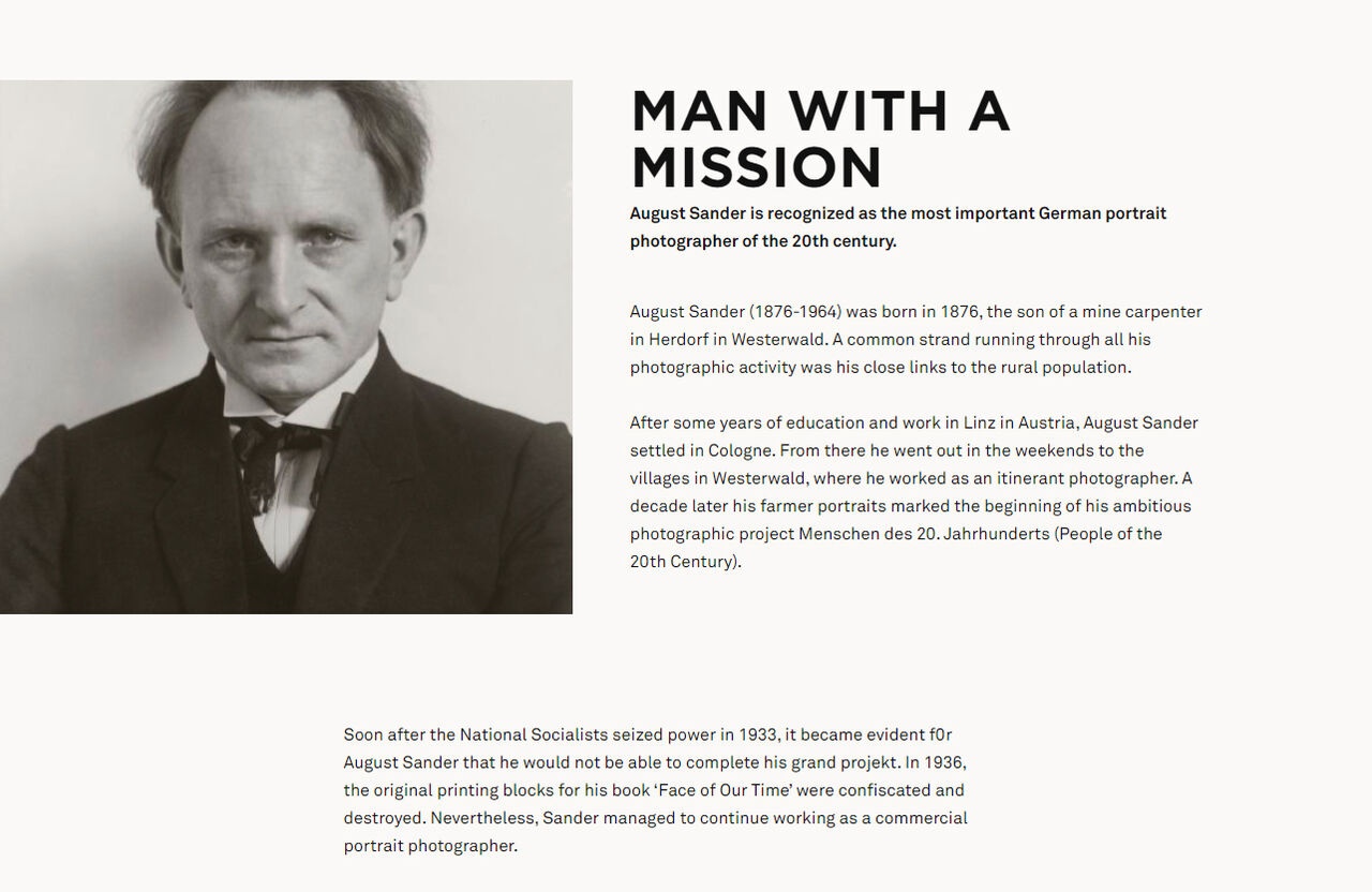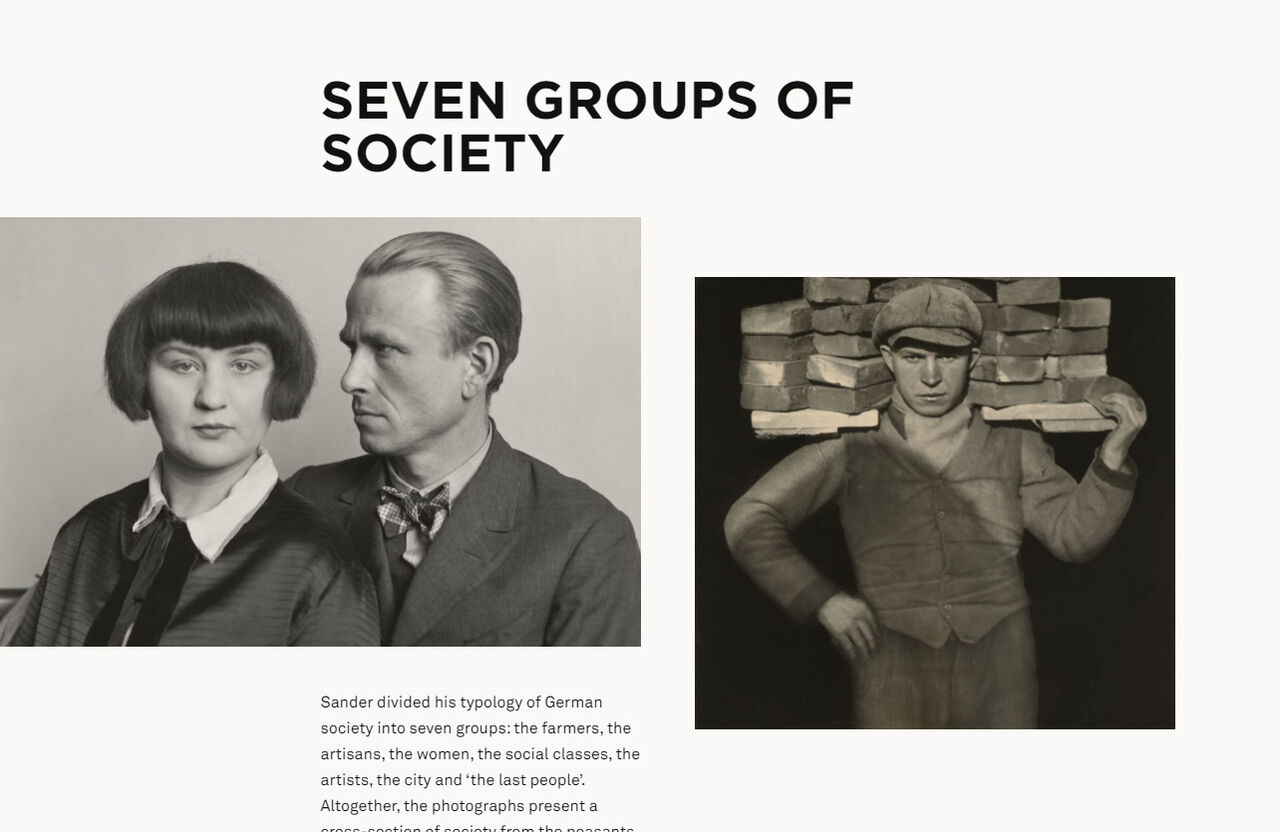 「20世紀の人々」において、ザンダーは被写体を7つのカテゴリ、「農民」「熟練工」「女性」「階級と職業」「芸術家」「町」「Last People(ホームレス、退役軍人、など)」に分類しており、全ての被写体を同様の威厳と強さで撮影することにより、逆に近代化が進むドイツの社会構造とヒエラルキーを明確に写し出しました。各々の被写体によって自然な背景で撮影を行う事で被写体自身に自己表現させる手法は、後のウォーカー・エヴァンス(1903-1975)やダイアン・アーバス(1923-1971)等、多くの写真家にインスピレーションを与えました。1930年代には「理想的なアーリア人を被写体としていない」という理由からザンダーはナチスに肖像写真を禁じられましたが、作品の比重を自然や建築に傾けながらも、制作は続けました。