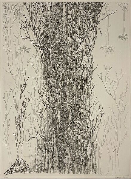 今回の小展示では駒井哲郎が28歳くらいの若かりし頃に制作された銅版画《思い出》と、フランス留学の前年1953年に資生堂画廊の初個展のために制作されたビュランによる意欲作《フューグ・ソムナンビュール(夢遊病者のフーガ)》の貴重な2作品を展示します。