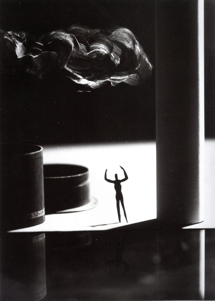 こうしたタートの写真について、絵画と比べればそれらは手すさびとしてつくられたものだろうと、私は根拠もなく考えていた。しかし、コロナーティさんのコレクションにあるヴィンテージ・プリントの《湖上の夜》【図5】によって、その認識は改められた――明るく浮かび上がった底面の上に、自然物に見立てられた複数の円筒や、両手を掲げた小さな人形/人間のような影が配され、画面上部の暗い部分には煙のようなものが浮かび上がっている――こうした構図は容易に見て取れるだろうが、私は他のカタログや研究書で、この作品に非常に似た別タイトルの作品を確かに見ていた。それは被写体や明暗の配分ではほとんど同一ではあるが、画面の上部には煙のようなものはなくただ真っ暗であった。つまり、どうやらタートは「オブジェのカモフラージュ」を無造作につくっていたのではなく、ヴァリエーションができるくらいの試行錯誤を重ねていたわけである。コロナーティさんにお会いする前に、メールで「この作品は別ヴァージョンではないでしょうか」と書き送ったところ、実際にお会いした際に「一目で違いに気がついてくれる人はなかなかいないんだよ」と喜んでくれたのも、いい思い出である。