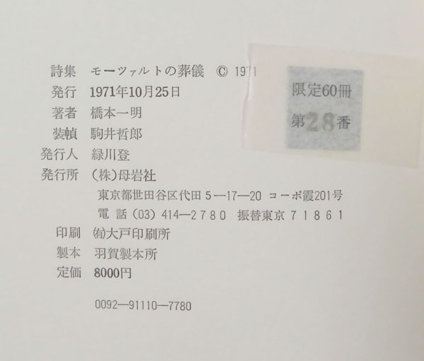 橋本一明詩集『モーツァルトの葬儀 』1971年