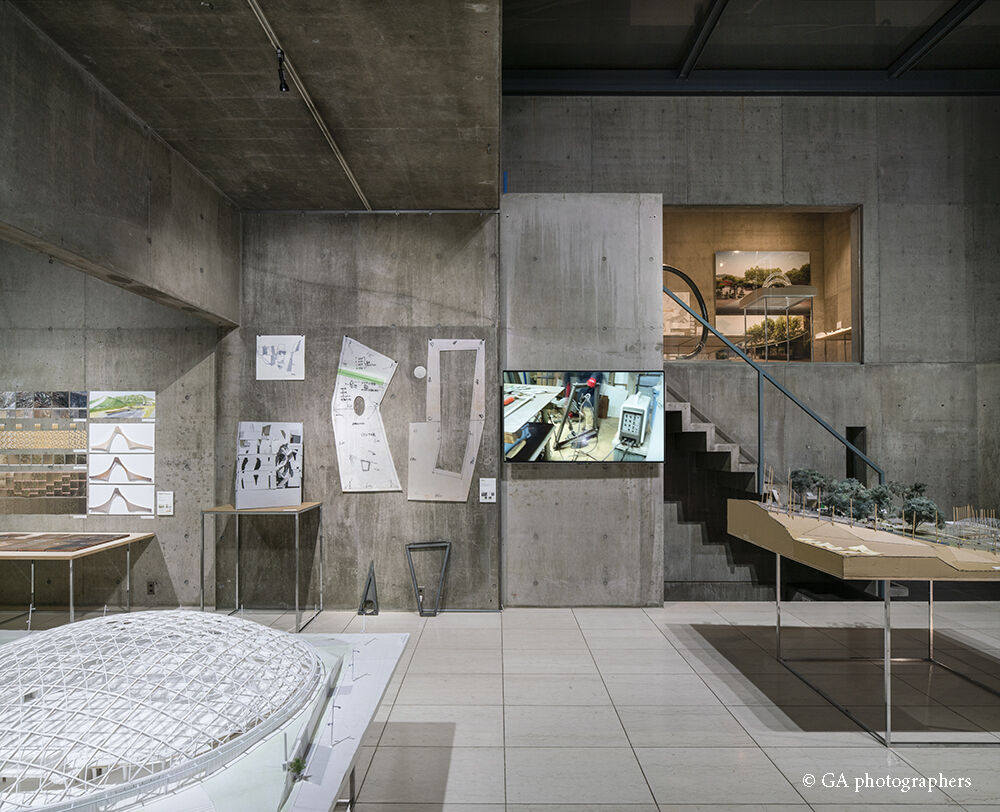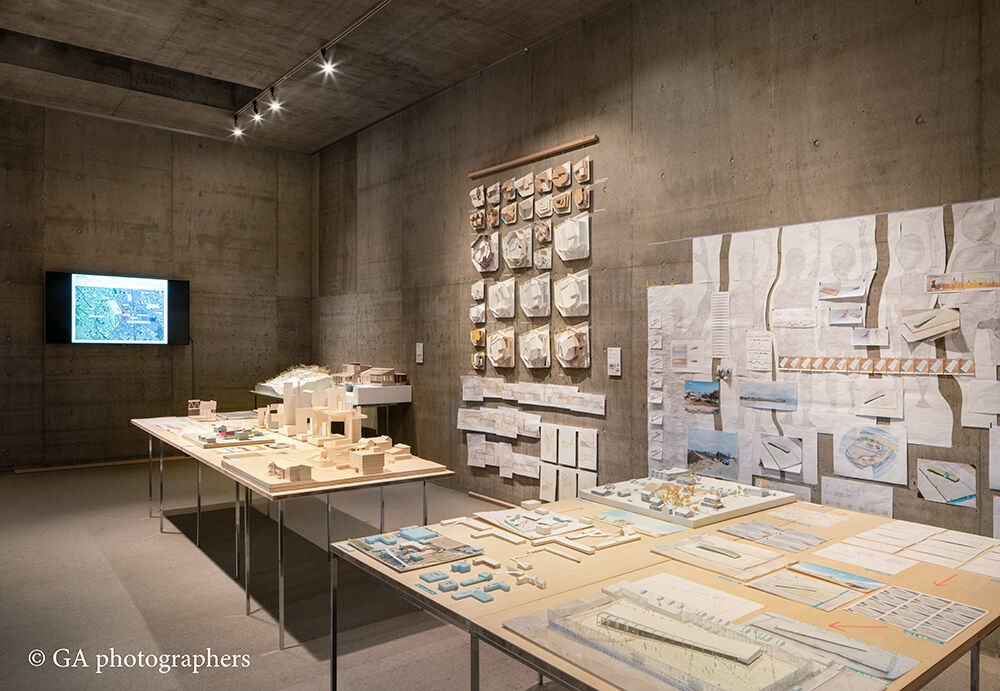 前置きが長くなったが、GAギャラリーでは、刊行誌と連動したグループ展形式で展覧会が催されることが多く、今回の「GA JAPAN PLOT 設計のプロセス」展は、『GA JAPAN 180』(2023年1月)に関連した展示である。同誌の特集であるPLOTでは、16組16作品のプロジェクトが紹介され、ギャラリーでは順不同で各プロジェクトの経過を示す資料が展示されている。全体に同時代性を孕む特徴、例えば社会背景に起因する、新しい公共、あるいは、集う、受容する、共存する、育むといったキーワードなどは見られるものの、何かしらの共通項を設けたり順路が拘束されたりしていない展示構成から判断するに、本展はそういった傾向をステイトメントとしているわけではない。館内では、計画それぞれの進捗や、建築家にとっての現段階の主題や関心事が様々である状況がバランスよく配置され、館内4か所のモニターに映像が添えられていた。