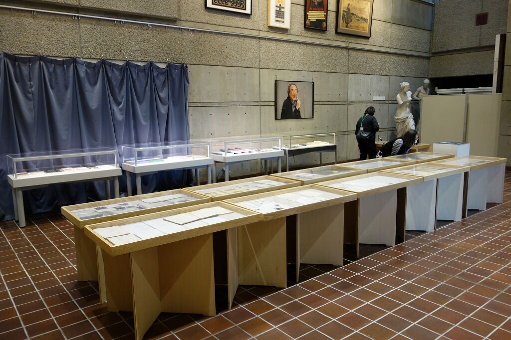 同展は、資料館1階の展示室1室とエントランスホールという限られたスペースで開催されていた。東京の書斎からはるばる資料館に引っ越してきた多種多様な形態の資料を今後の有用化と保存のために、分類・整理し、同時に展覧会をどういう流れで編むか議論し、資料のデジタル画像化を経て、こうして個々の展示ケースに収めた足取りを推察すると、関わった方々の実直さが伝わってくるように思う。大きな図面や模型はなく面積こそコンパクトな展示だが、研究者の資料という特性に忠実な展示だった。