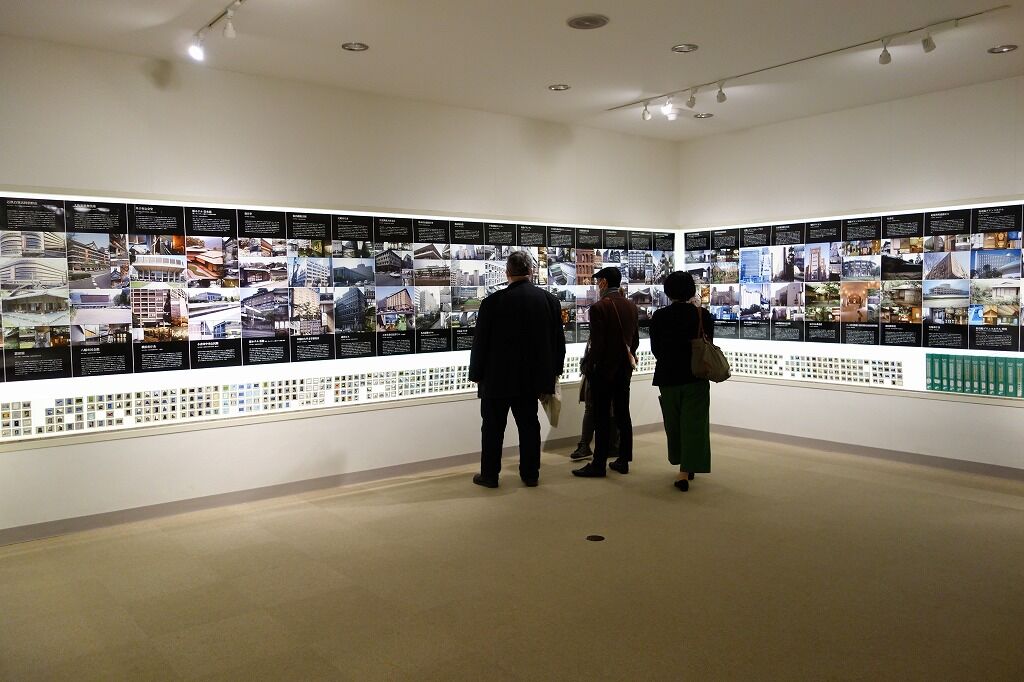 展示室には、2010年9月に武蔵野美術大学新宿サテライトで行われた長谷川による講演「私の《モダニズム》批評、その後」の記録映像、1970年代後半~2000年代(推定)に撮影したと解説されている35mmのポジフィルムとネガフィルムのスリーブ、スライドファイル21箱とそれらに保管されていたスライドの一部が展示されている。2000年代にパワーポイントが普及するまでは、ポジの像をマウントしたスライドを投影機器のドーナツ状のカセットに挟んで一枚一枚送りながら授業や講演が行われていたわけだが、低温低湿の保存環境が求められ、かつ、裏面から光を当てて示したいスライドを展示する方法として施された壁面展示ケースの工夫に感心した。写真フィルムからは、長谷川がカメラを携えてレンズの画角に収まらない建築をなんとか記録しながら、村野の建築を吸収していった姿が想像できる。