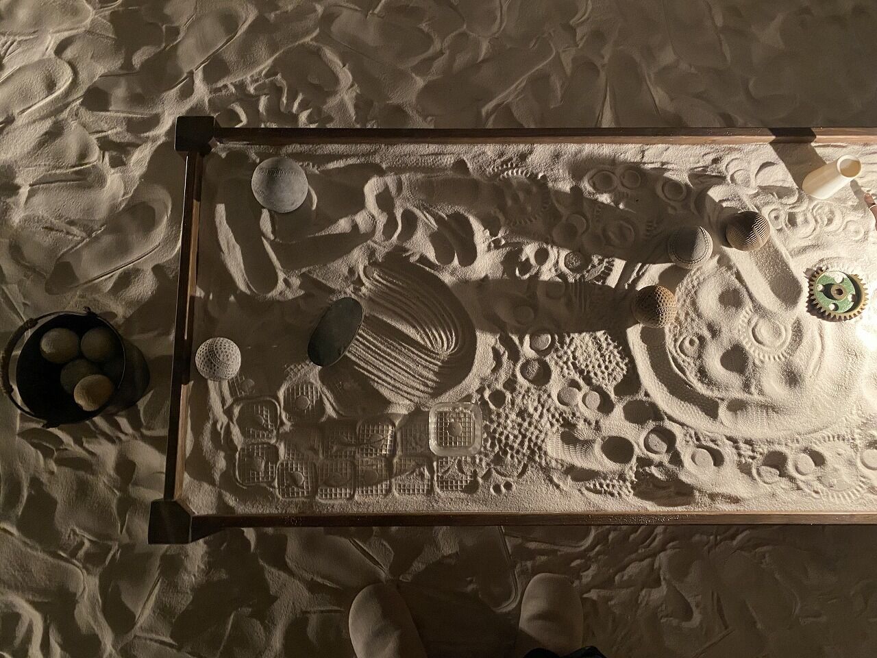 砂の上には私の前にいた人が残していったであろう物の像がくっきりうつっています。私もそれを躊躇なく上書きして、転がっている古い野球ボールや小皿、ブラシを転がしたり押し付けたりしてみました。誰かが紙に描いたものを上書きするのは失礼だけれど、砂は当たり前のように上書きしてしまうのは、子供のころから砂場でそうやっていたからなのか、留まるようなものではないからなのか・・・。そして、転がしてできた跡をみると、野球ボールにも色んな柄があるし、野球ボールの柄って意外と可愛いんだなと気づかされたり・・・
