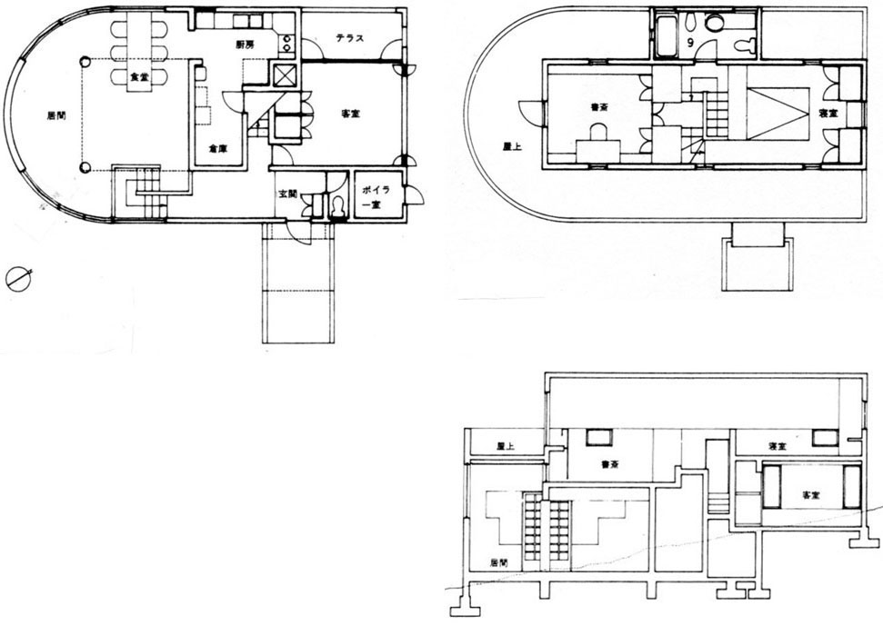 玄関から床レヴェルをずらしながら螺旋状に上昇する特徴ある空間構成は、設計がかなり進んだ段階で現れた。着工の半年ほど前の設計案(「反建築的ノートⅥ」『建築文化』1974年12月)は明確な2階建てであり、玄関は居間と同じ1階にあって、2階中央部では十字状の廊下が書斎と寝室、浴室、客間を結んでいたのである。この決定的に重要な変更はアドルフ・ロースの空間からの影響を推測させるが、担当した西岡弘によれば、あくまで敷地の勾配に馴染ませるための検討結果だった。じっさい、玄関を1階に置く先行案では、玄関ポーチは地面に半分埋まり、両側は低い擁壁になっていた。玄関の高さを1階と2階の中間に設定したことが、玄関を地表高さに無理なく一致させるだけでなく、この場所にあった書斎を居間の上に移動し、客室と寝室を上下に重ねる結果を生み、螺旋状空間の生成の鍵となったのである。