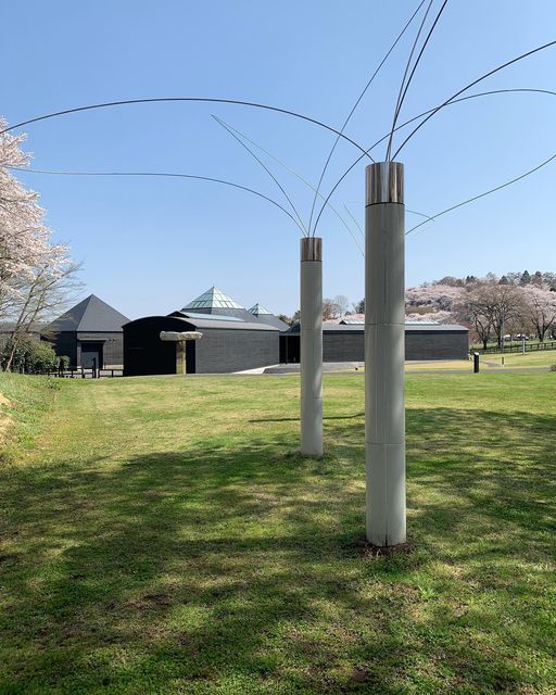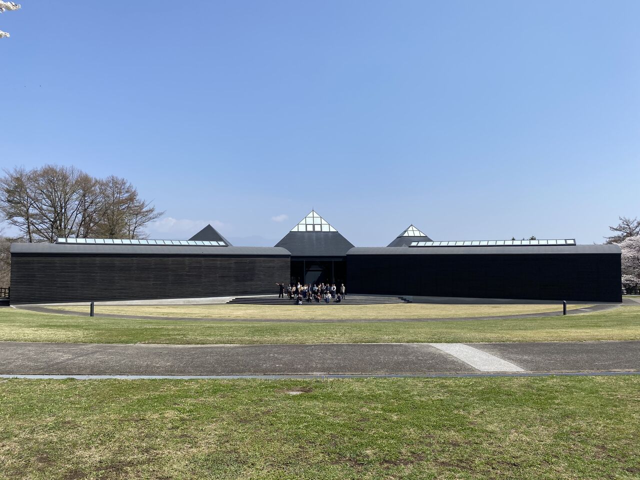 バスを降りると、原美術館ARCの青野和子館長はじめ、原美術館時代からの素晴らしいキュレーションの歴史を支える職員の方々が迎えてくれた。広い青空の下、玄昌石スレートが鈍く光る寄棟の屋根屋根、新緑の色と対比する黒色塗装の杉板が貼られた壁、両腕を広げたような形の分棟に囲まれた野外劇場、草原に点在する屋外の常設作品が次々と目に入ってくる。