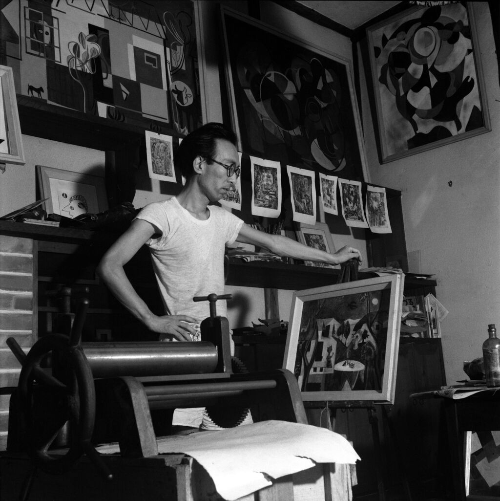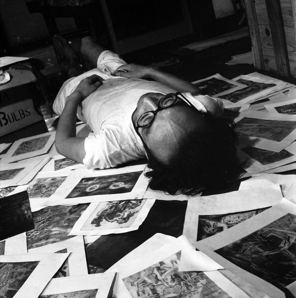 旧蔵者の湯浅英夫さんの名は瑛九研究者なら誰もが知っています。評伝や展覧会カタログに掲載されることの多いアトリエ(浦和)の瑛九の姿を撮影されたのが湯浅さんでした。