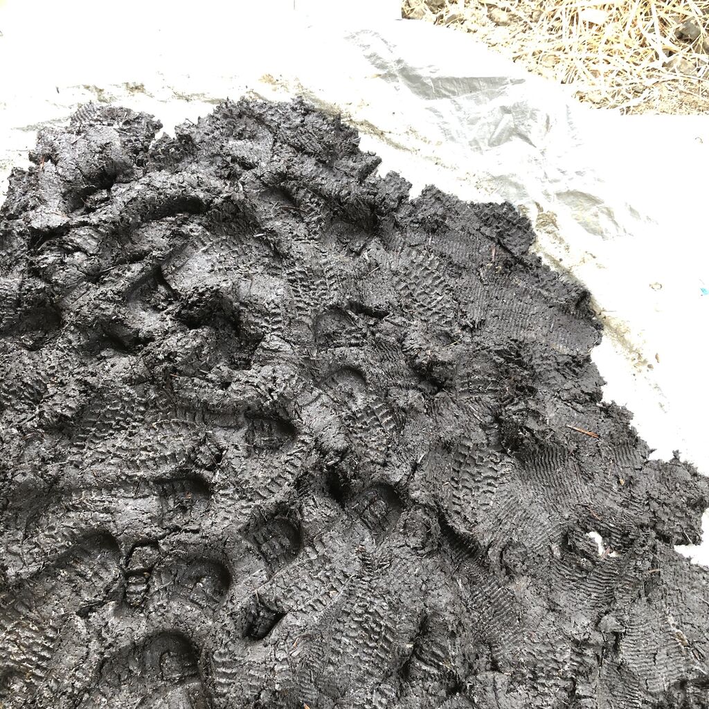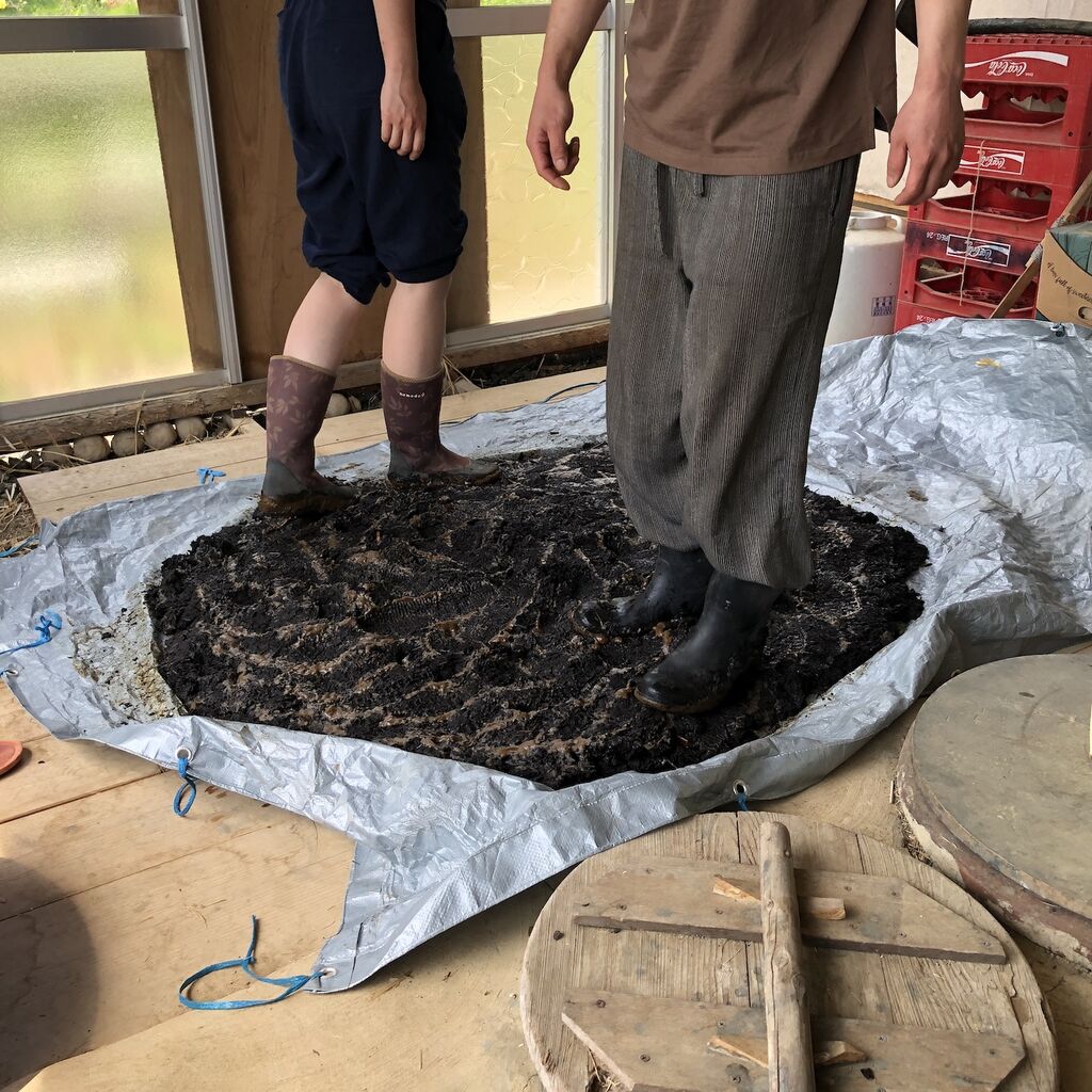 (藍建ての初期工程。蒅に灰汁を足し、足で踏んでいっているところ)