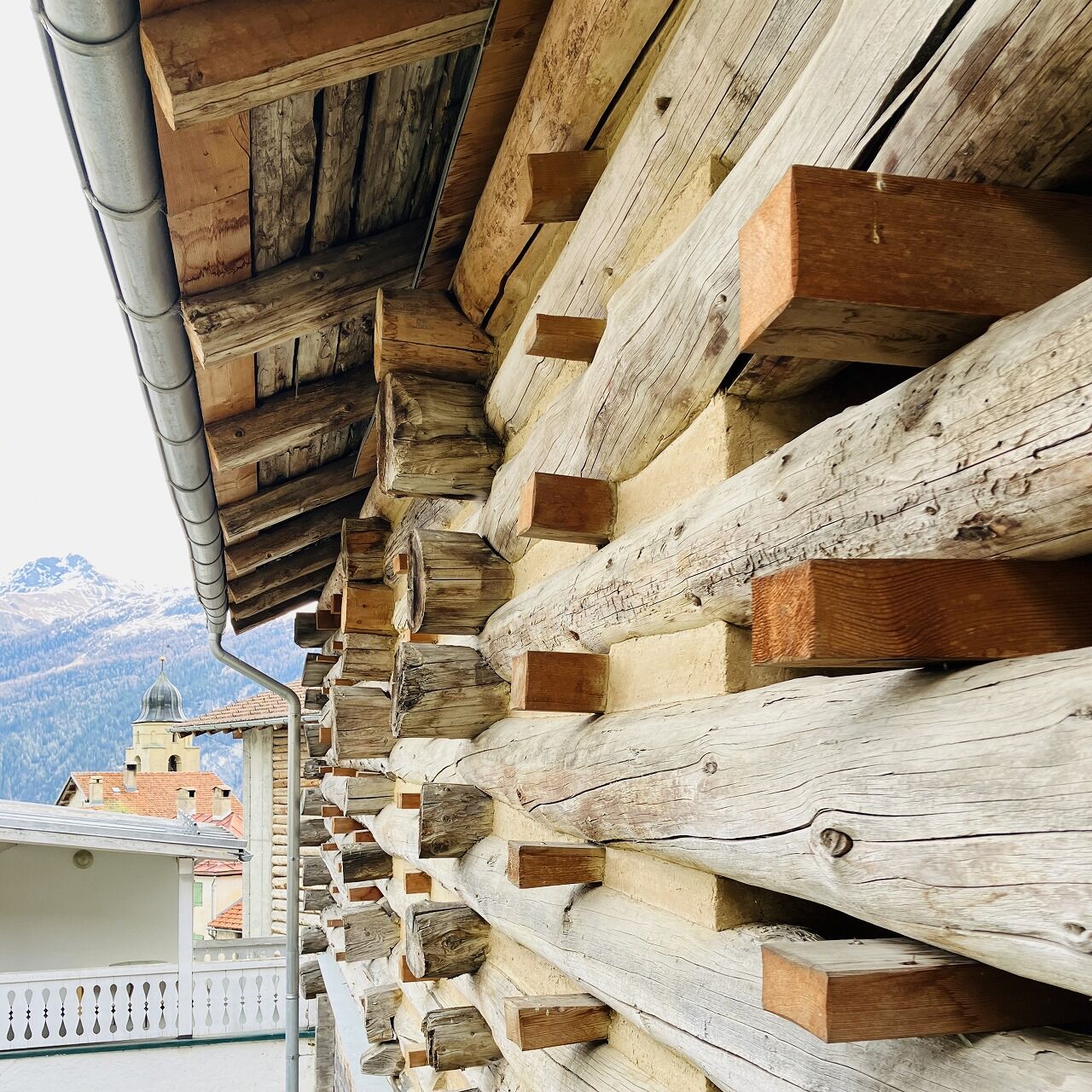 これもログハウスの要領でできていますが、もともと材と材の間隔をあけて風通しが良くなるように作られていた外壁の、そのギャップを粘土で埋めることで内部と外部を仕切っています。