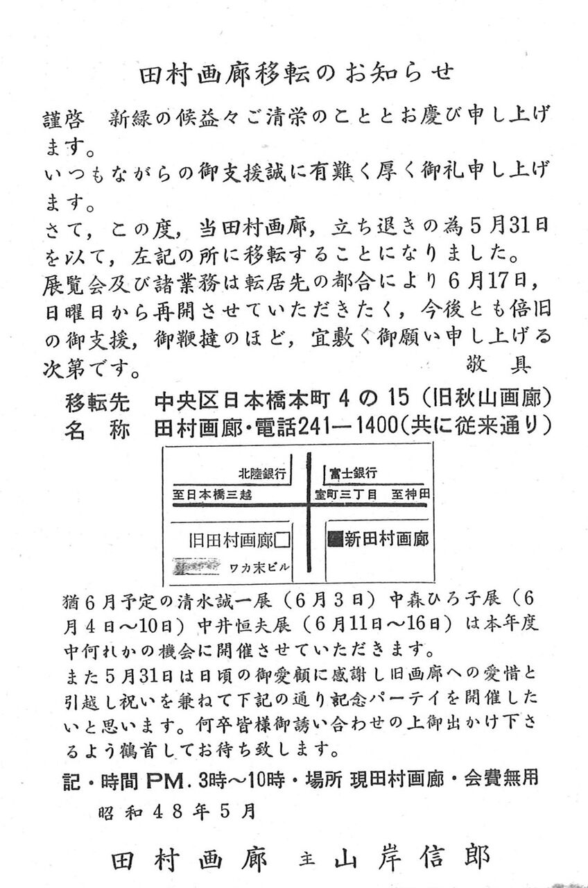 山岸さんは、68年に『三彩』誌で展覧会評を連載し、また秋山画廊に少しの期間勤めた経験もあった。知人の医者に病院移転後の建物で画廊をと頼まれた。江戸通りに面した旧秋山画廊の斜め前だった。大家の名「田村」をとって画廊名にした。ある意味、勢いもあって画廊を始めたのかもしれない。