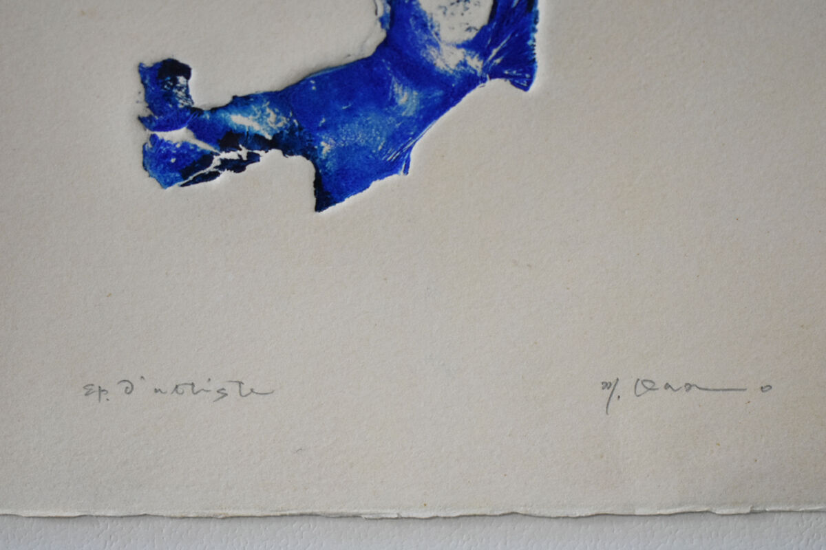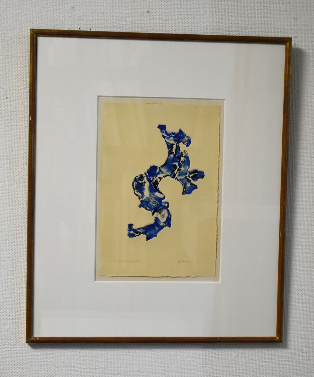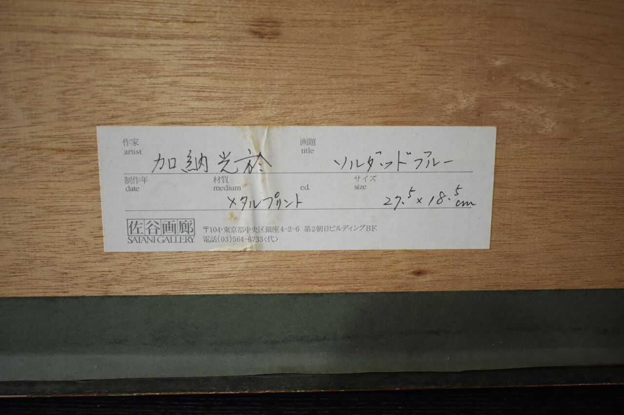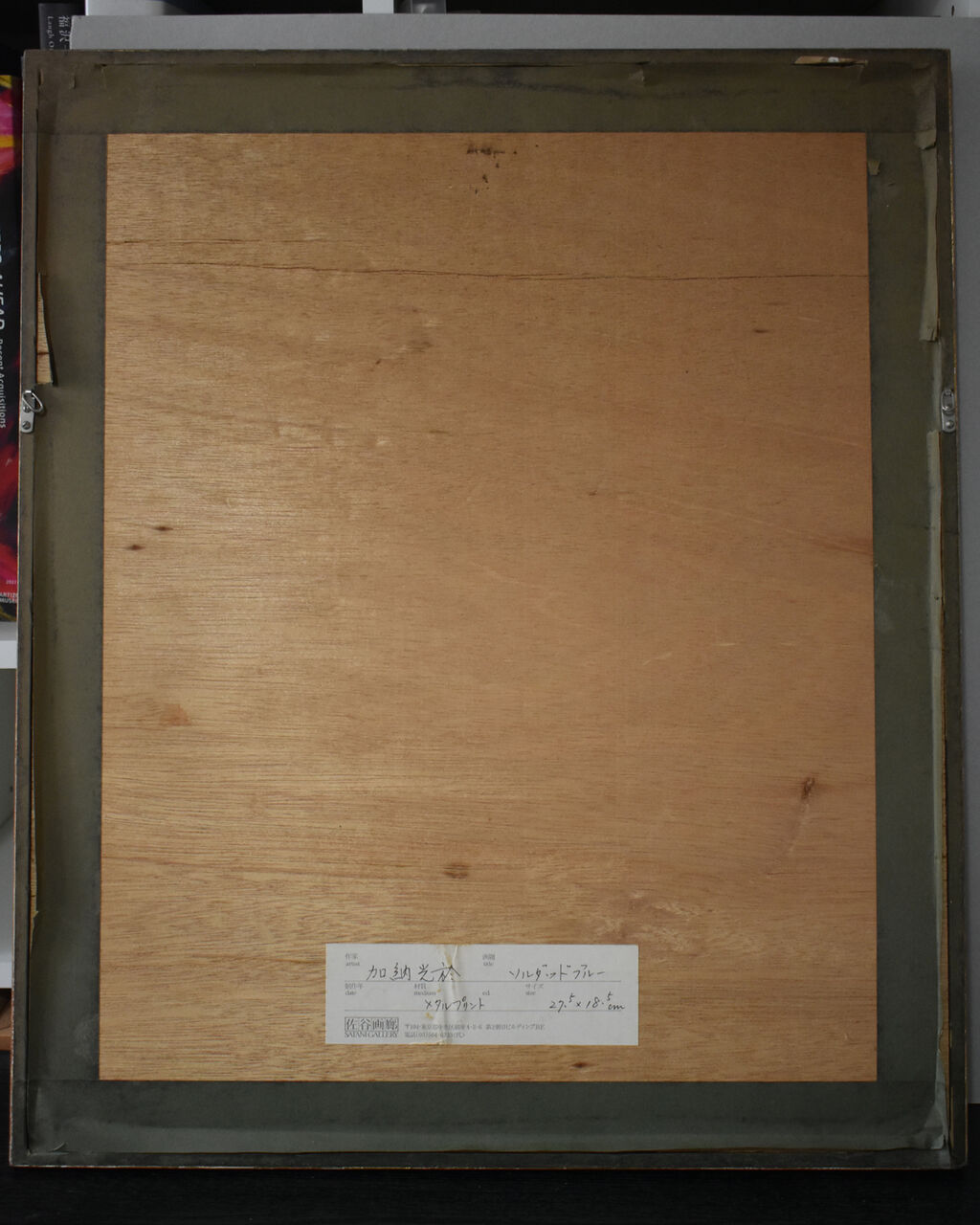 こちらは<亜鉛板をガスバーナーで処理しそれを基本的には凸版で刷った>作品。清家さんは、1984年の2月に初めて銀座の佐谷画廊を訪ねた折、一目で気に入り、その場で購入を決めたそうです。美しい青の輝きにぜひご入札ください。