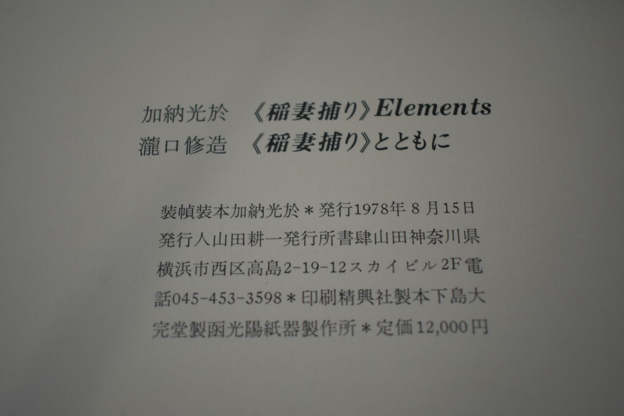 <加納と瀧口の共作として二つの詩画集が遺された。『《稲妻捕り》Elements』(書肆山田1978年8月刊)と『掌中破片』(書肆山田1979年1月刊)である。いずれも瀧口の最晩年に刊行され、奇しくも『掌中破片』は最後の詩画集となった。>