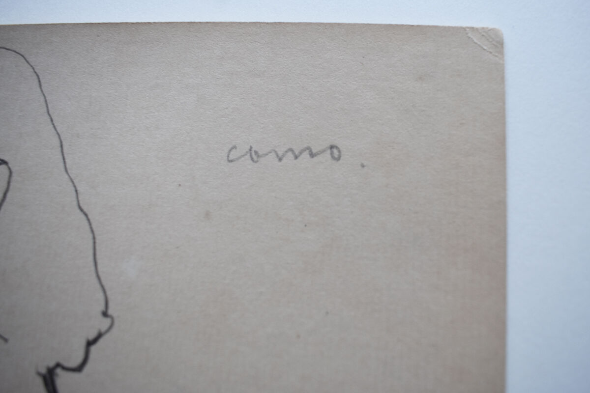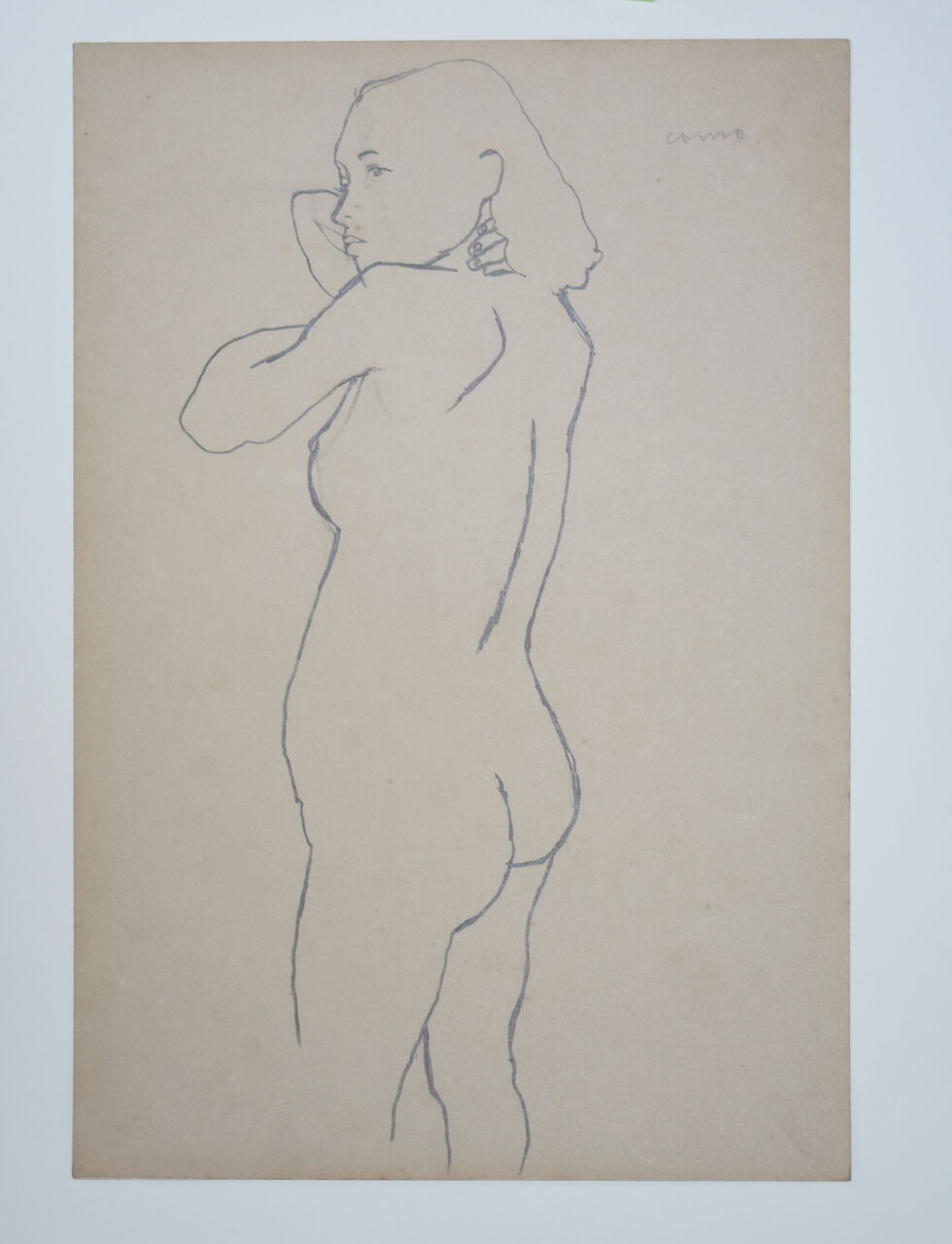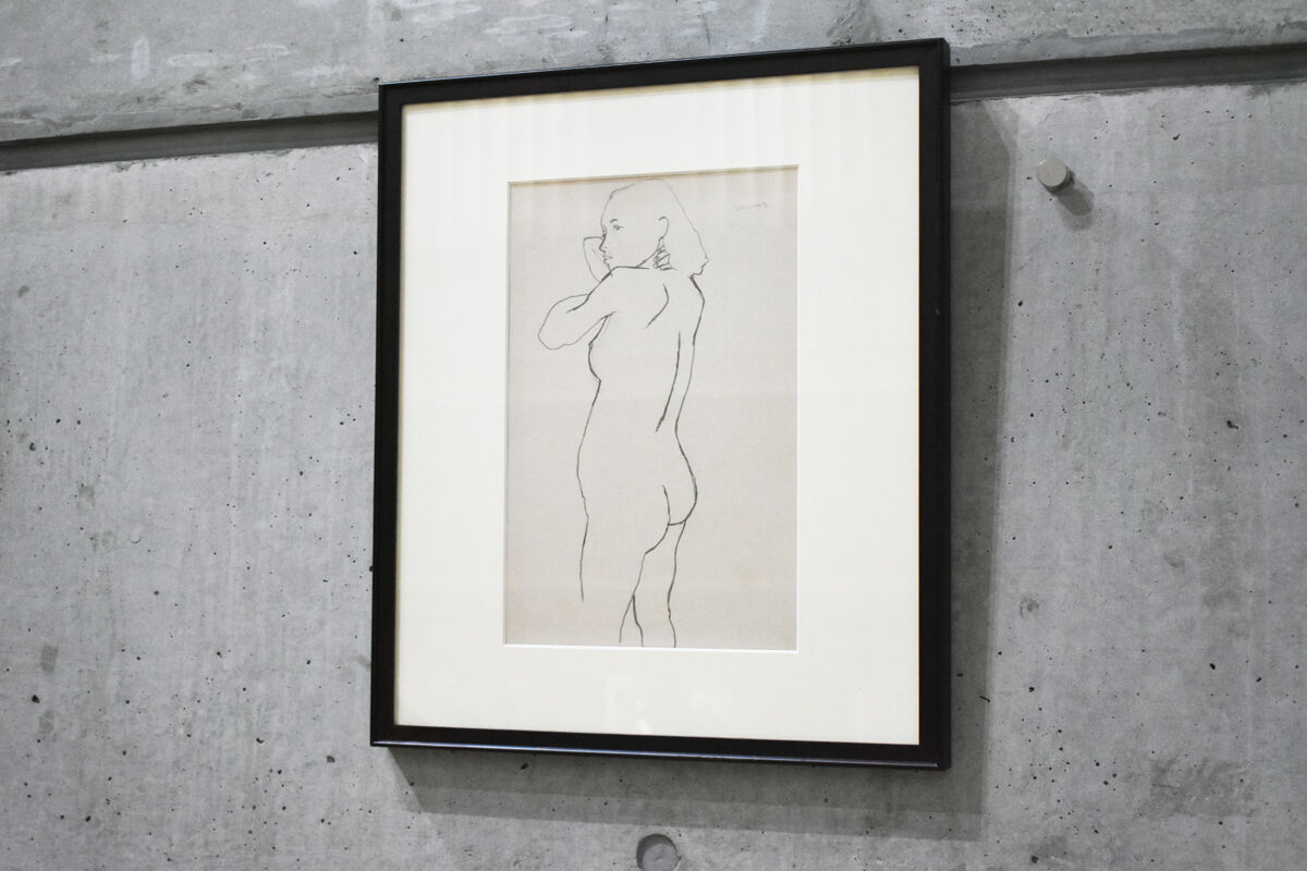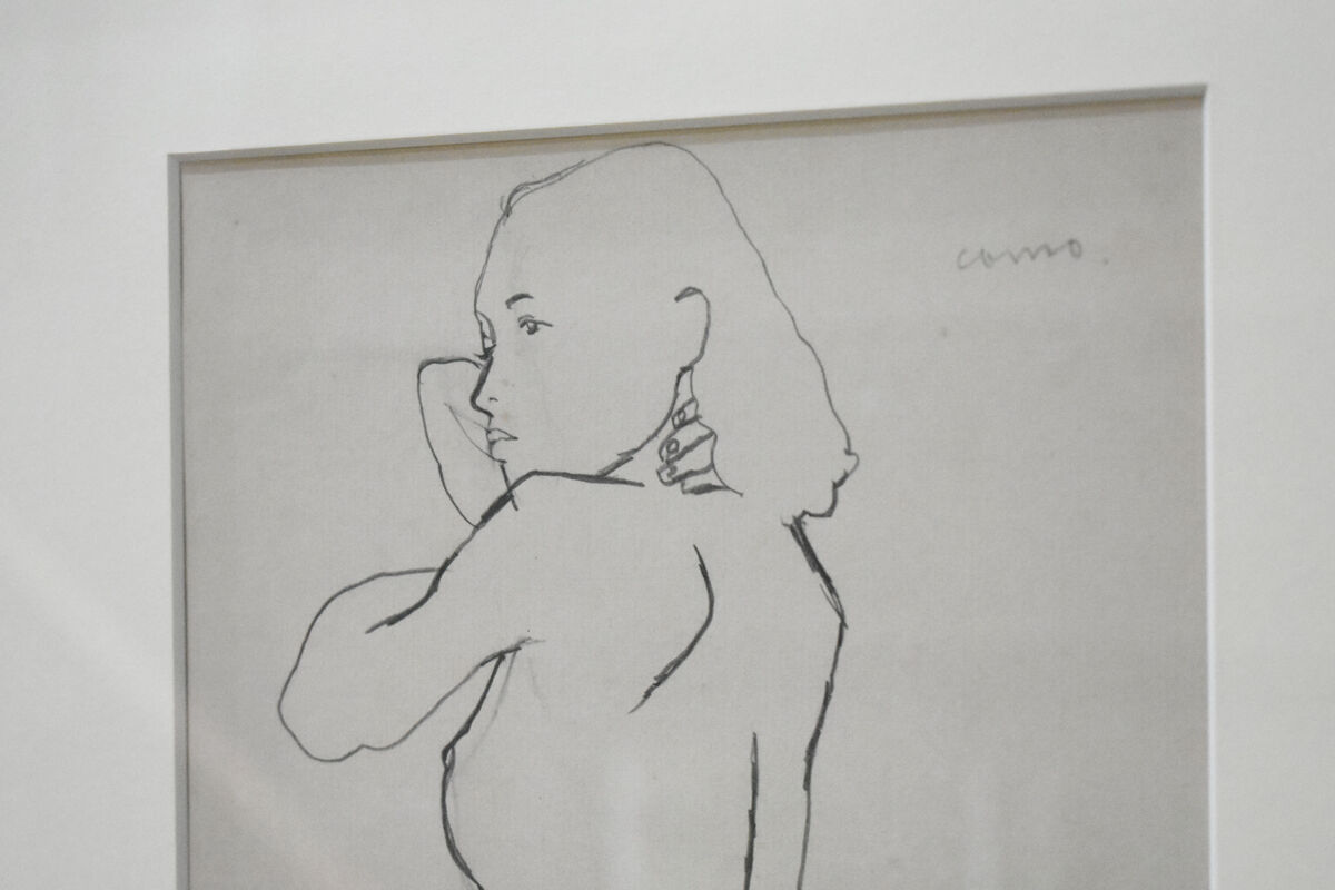 <古茂田守介のコンテによるデッサンで非常に完成度の高い作品である。全く無駄な線がなく、モデルの裸体と表情を見事に捉えている。