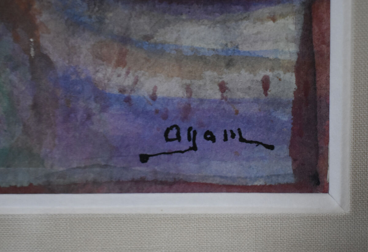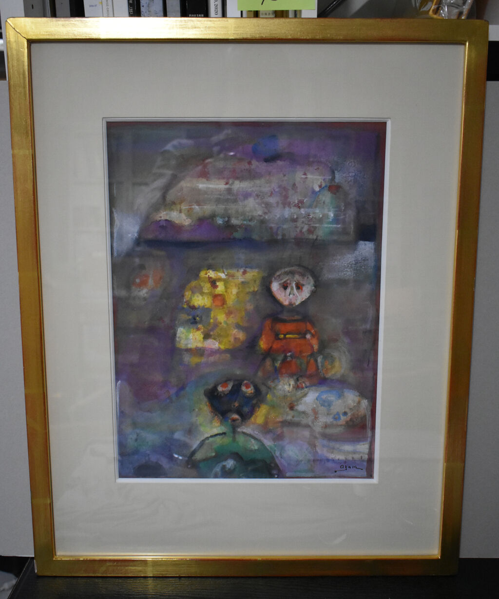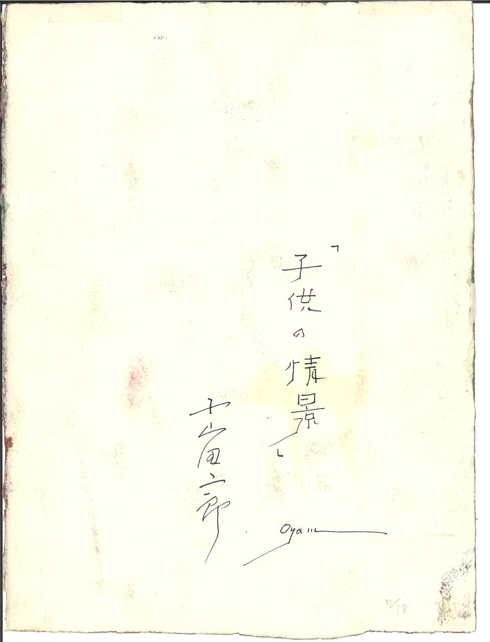 <小山田は水彩画による子供をテーマにした多くの作品を制作しており、「子供は小山田にとって親しみのあるモチーフだったが、1956年に長女が生まれて以降は更に子供を描く絵が増えている。水彩で描かれる子供たちは半円や三角、四角といった幾何学形を組み合わせて描かれ、どこか不安定な印象を与えながら色彩の溢れる幻想の世界を漂っている。」(「生誕100年小山田二郎」展カタログ2014年11月府中市美術館刊より)と小林真結学芸員が解説しているが、この作品もそれに該当する。>