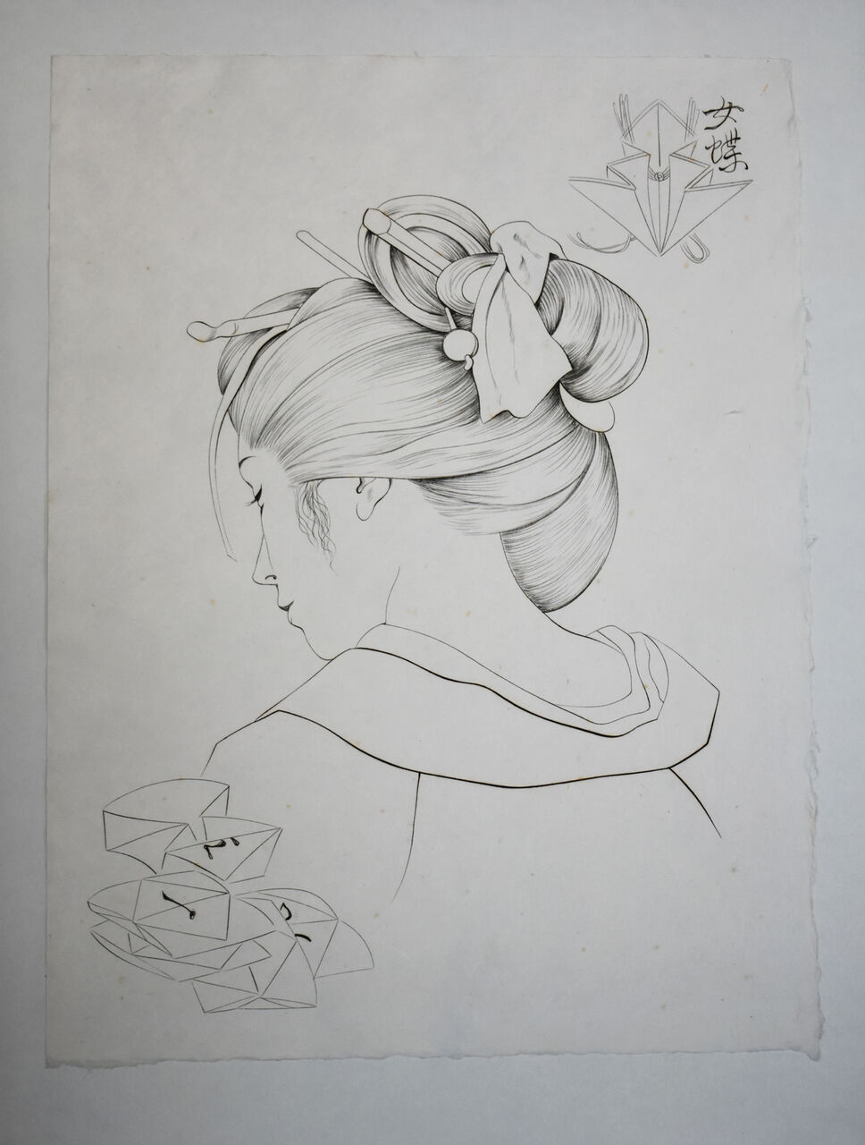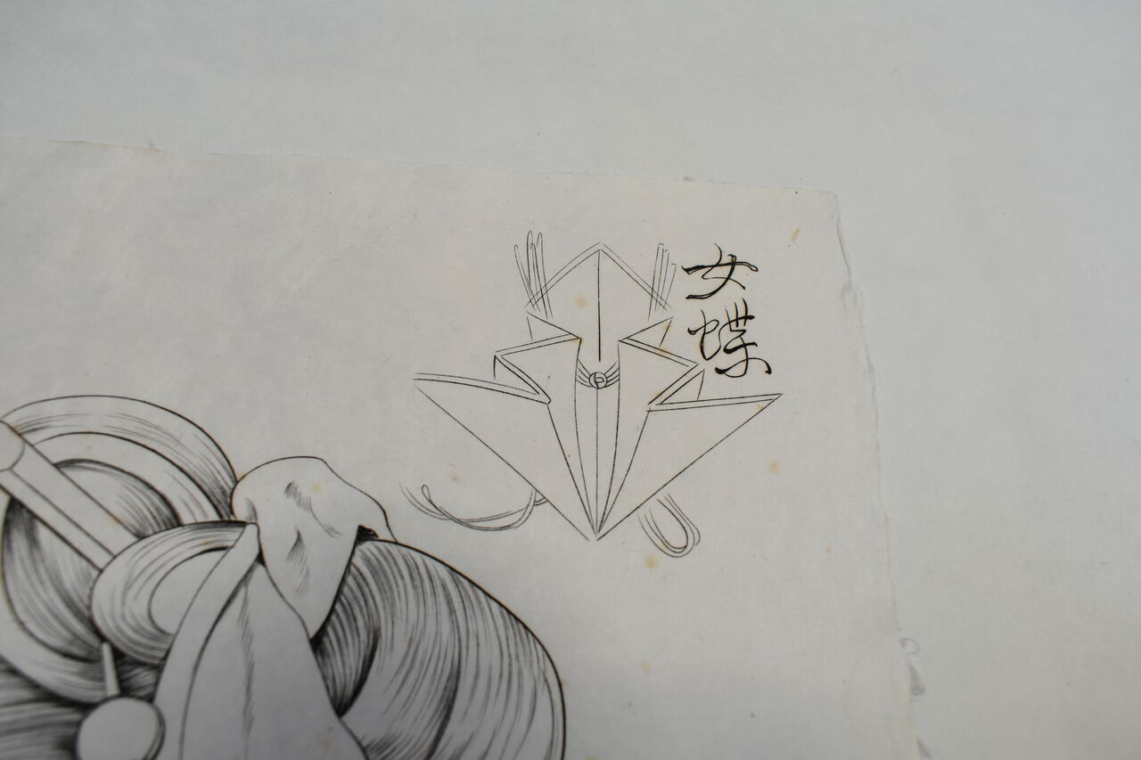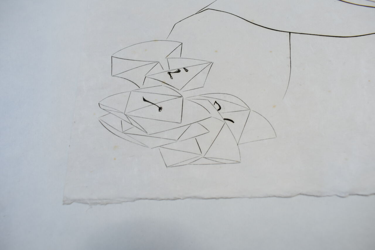 <この作品は、フランスの詩人で劇作家のジャン・コクトーが1936年に刊行した世界一周旅行記の中から日本に関連した部分を抜粋したテキストに藤田の新作銅版画25点をセットにした豪華限定本《海龍》(1955年12月パリ刊)の中の1点である。175部限定で内150部のNo.1~No.15までは特別版となっており、本作はNo.7の和紙刷りである。>