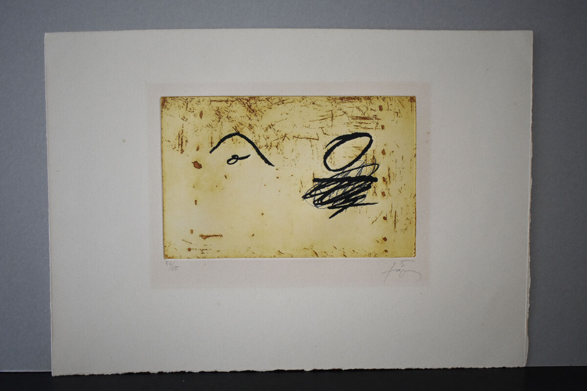 〈彼の絵はしばしば壁に例えられるが、スペイン語でタピエスは壁を意味するというのも偶然だろうか。本作品も黄土色の壁に描かれた落書きのように見える二つの記号の絶妙な間合いが禅画か書を連想させるが、タイトルの「Deux 0」(二つの零)は東洋的な「無」と関連しているのかもしれない。〉