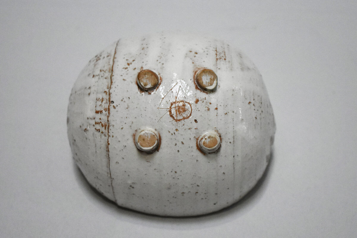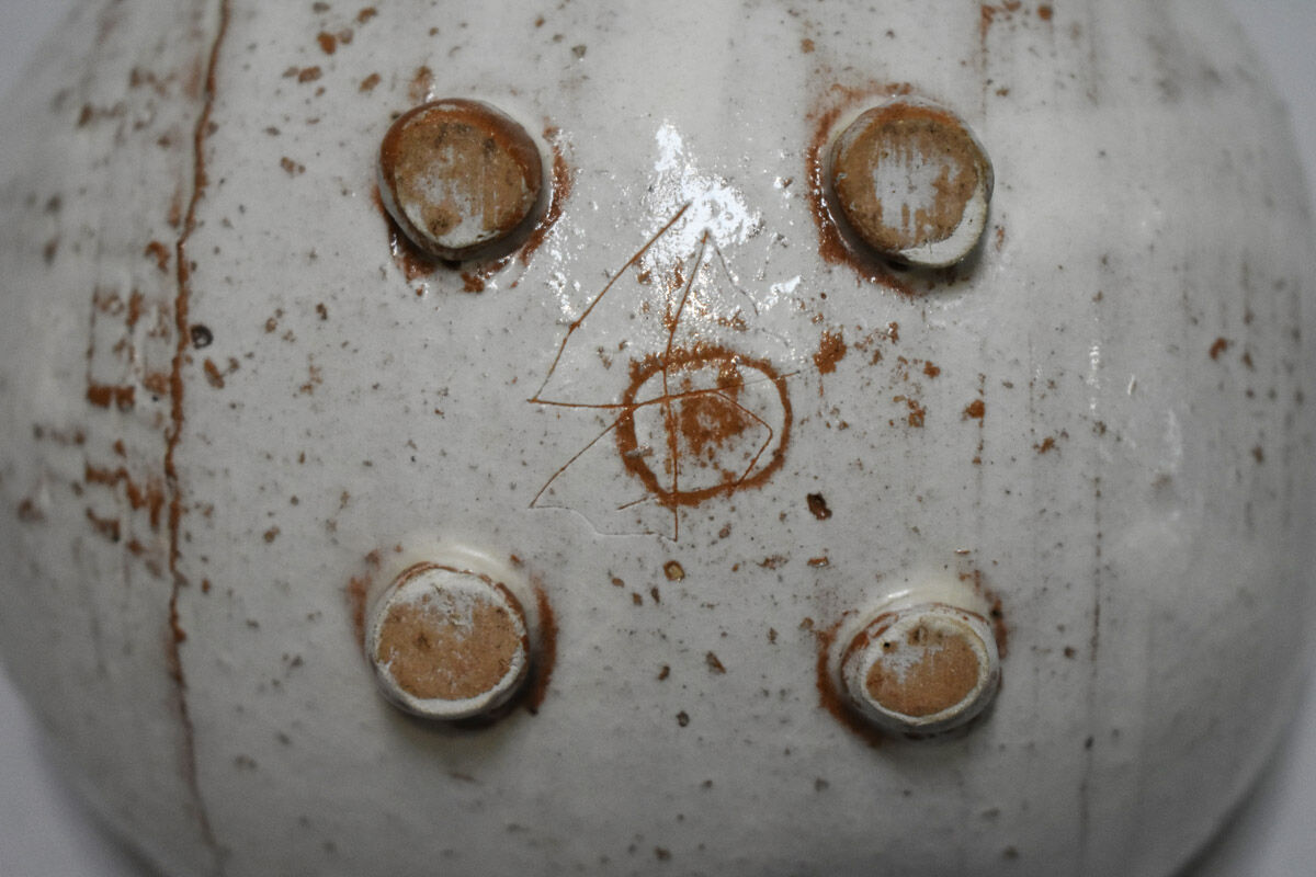 <八木と言えば前衛的なオブジェ焼があまりにも有名だが、これは茶道の菓子器用に作られたものだろう。八木ならではの斬新な造形で、ロクロを使って壺のように成形したものを中心から二つに切り分けて対の作品として仕上げたものではないかと思われる。ロクロの名手と評されただけあって陶土の切口の厚さが均等でしかも薄い。シンメトリーな形でうっすらと地肌を見せる白化粧が美しい。>
