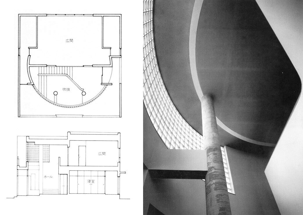 左から:辛島邸 2階平面図と断面図、辛島邸 ホール内観見上げ(『建築文化』1981年12月)