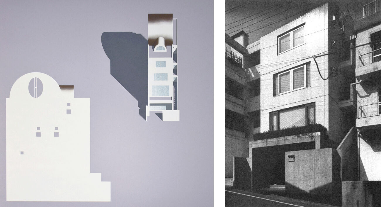 左から:《ヴィッラAo》シルクスクリーン、青木邸 外観(『新建築』1981年1月)