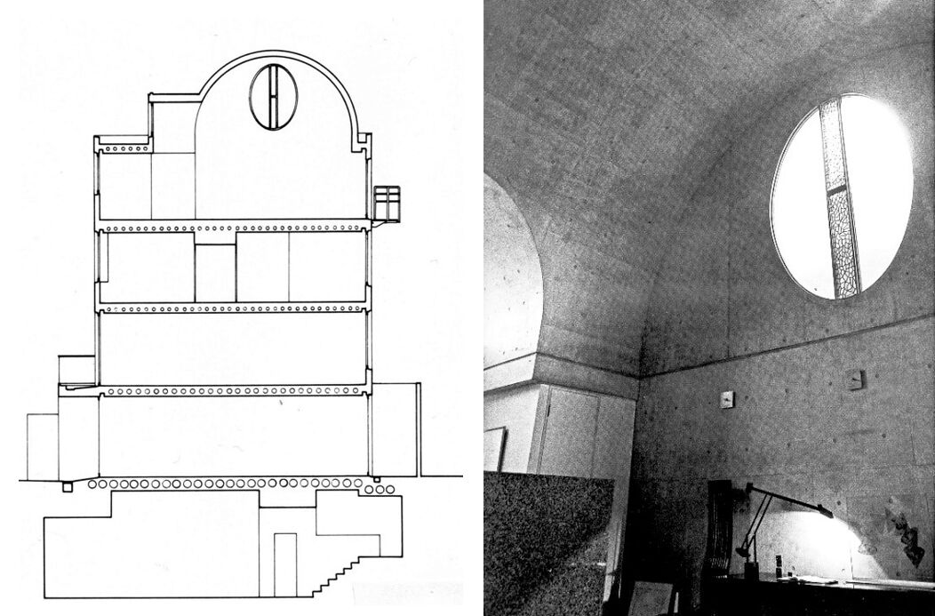 「法規的な制限内を要領的に最大限利用するため、最上階の居間に大きいヴォールトが用いられた。この空間は家具に至るまでほぼ黒一色である。そこで、手さぐりをするような闇がたちこめるわけだが、閉ざされたように見えるこの内部に、ときに月光がさしこむことがある。そんな時、みがかれた金属面はにぶくひかりはじめる。闇が深まり、わらんじ屋のロウソクに輝らされた厚い闇よりも、いっそうなまめかしく感じるはずである。」(同上)