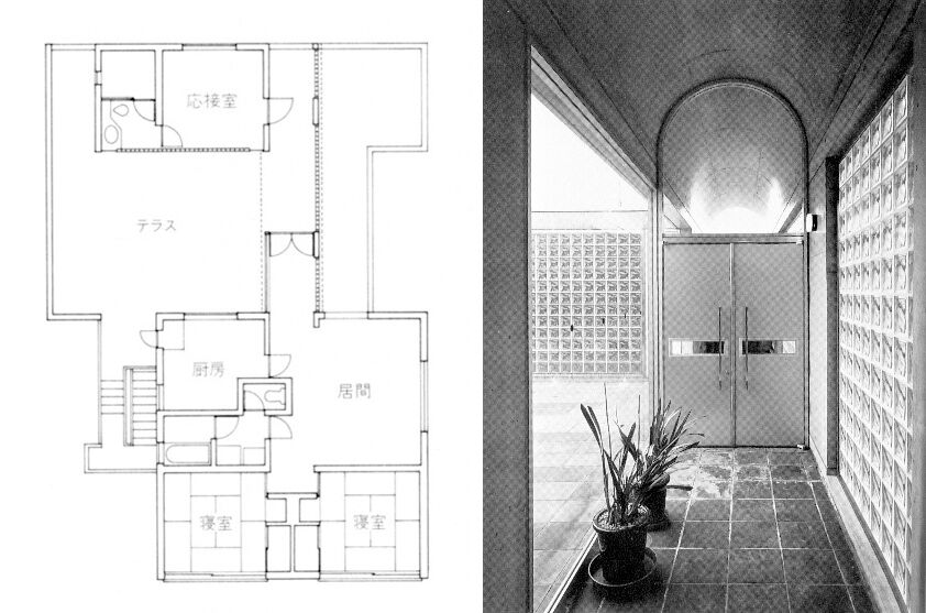 左から:伊良原邸 3階平面図、伊良原邸 玄関内観(『建築文化』1981年12月)