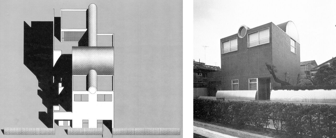 「キラキラ光るこれらの金属製の生活器具は、谷崎潤一郎が「陰翳礼讃」において嫌悪した素材であった。日本の伝統的な「闇」が支配する、木と紙と藁で構成されたほのかなグラデュエーションする空間に、金属製品は違和感だけを生みだす、と谷崎は考えていた。もし、傲慢ないいかたが許されるならば、私は、この嫌悪された素材だけで、同質の「闇の空間」をつくってみせようと考えたことだ。」(『GA HOUSES 14』, 1983)