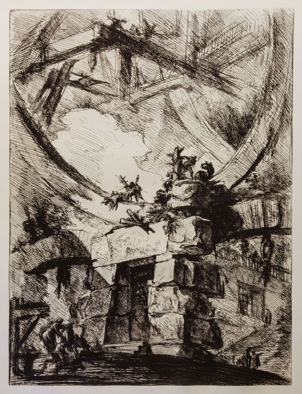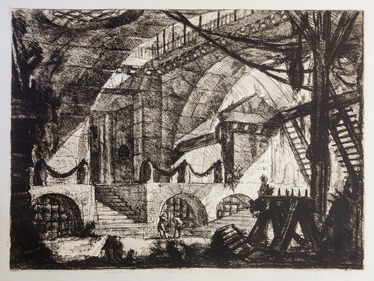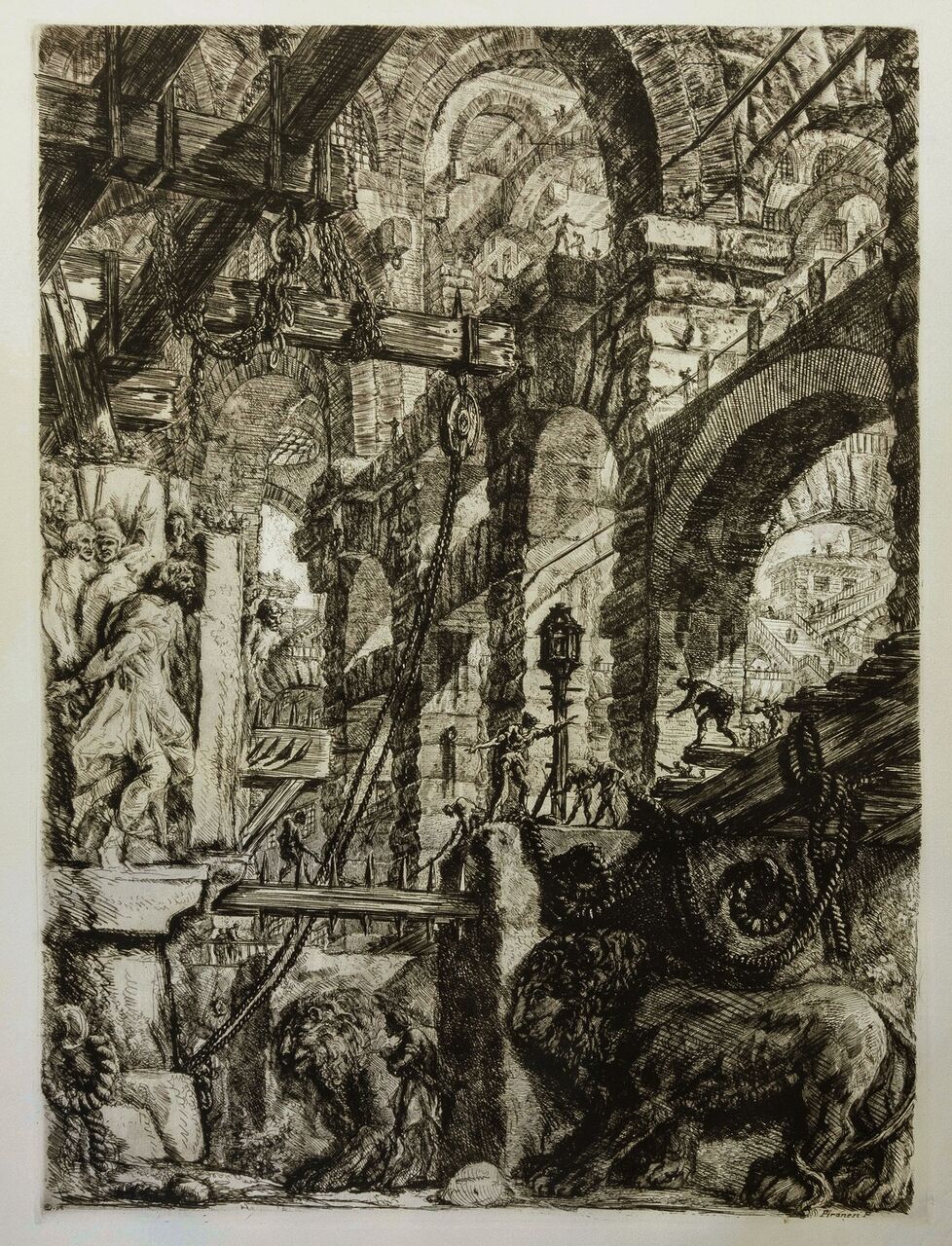 今では版画家として記憶されているジョバンニ・バッティスタ・ピラネージは、実現した建築は極く僅かでしたがローマの建築家でした。しかし、実際の建築よりもピラネージが描いた写実的で幻想的な版画(エッチング)はローマを訪れた旅行者によってヨーロッパ中に広まり、18世紀の人々の古代ローマやギリシャに対する見方を根底から覆してしまいました。牢獄幻想や廃墟となった古代都市を描くピラネージの果てしない想像力は実際の建築としては実現せず、紙の上に豊かな実りをもたらしました。特に「牢獄」シリーズの幻想的な世界は、後世の文学者などに大きな影響を与えた傑作です。
