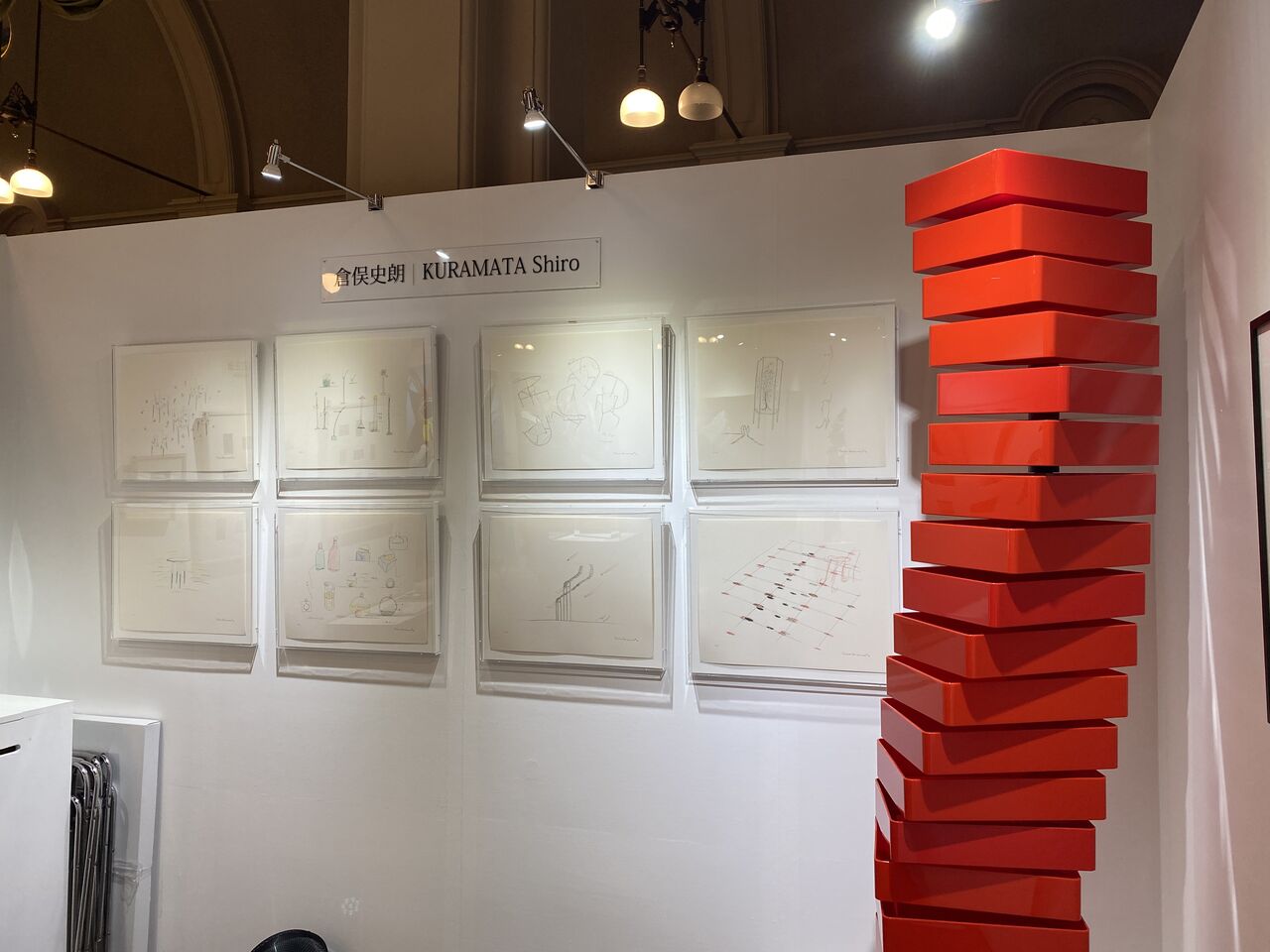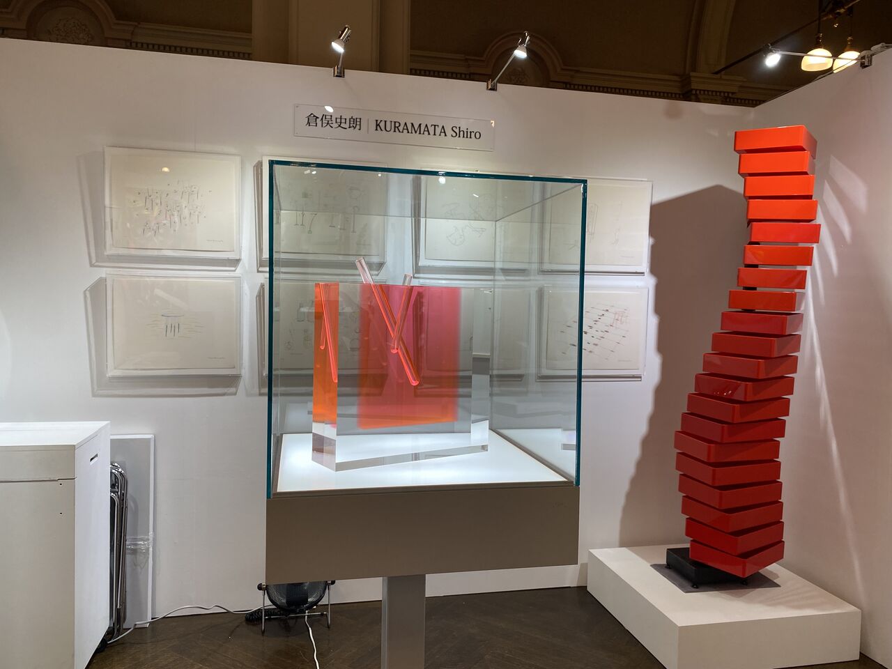 倉俣史朗フラワーベースを中央に展示。夏休みなので子供も多く、うちのブースにも美術が大好きと言う11歳の男の子が倉俣花瓶(二輪)に釘付けになっていて「どこがすごい?」と聞くと試験管が2本交差しているところが数ミリしか無くすこしでも曲がったら穴が空いちゃうから凄い!とキラキラした目でいうのです。将来キュレーターの卵を見た気がしました。(ときの忘れものスタッフ加畑)