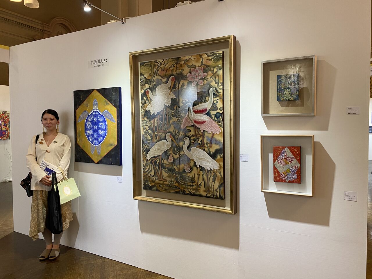 7月28日には沖縄から画家・仁添まりなさんがご来場くださいました。会期中は生物学者・福岡伸一先生がブースに寄ってくださいました。仁添まりな作品《木の葉虫とビワハゴロモ》をみて「いいねぇビワハゴロモ」とお声がけいただきました。