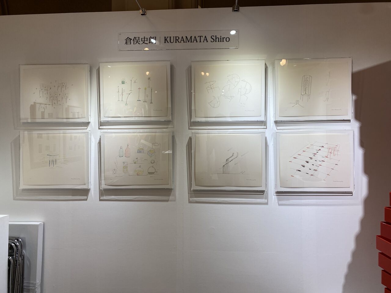 中央の壁には、倉俣史朗カイエ1集~3集から選抜した8点を額装で展示。デザインを勉強してる学生さんがいらっしゃり、カイエの版画をしみじみ観ていたので話しかけてみたくなり、会話をしていたら学生さん徹夜で苦労してやった課題がなにかのアクシデントですべて消えてしまったとのこと。タブレットだけで制作することのあやうさを感じて紙で残すことの大切さを思っていたということでした。(ときの忘れものスタッフ加畑)