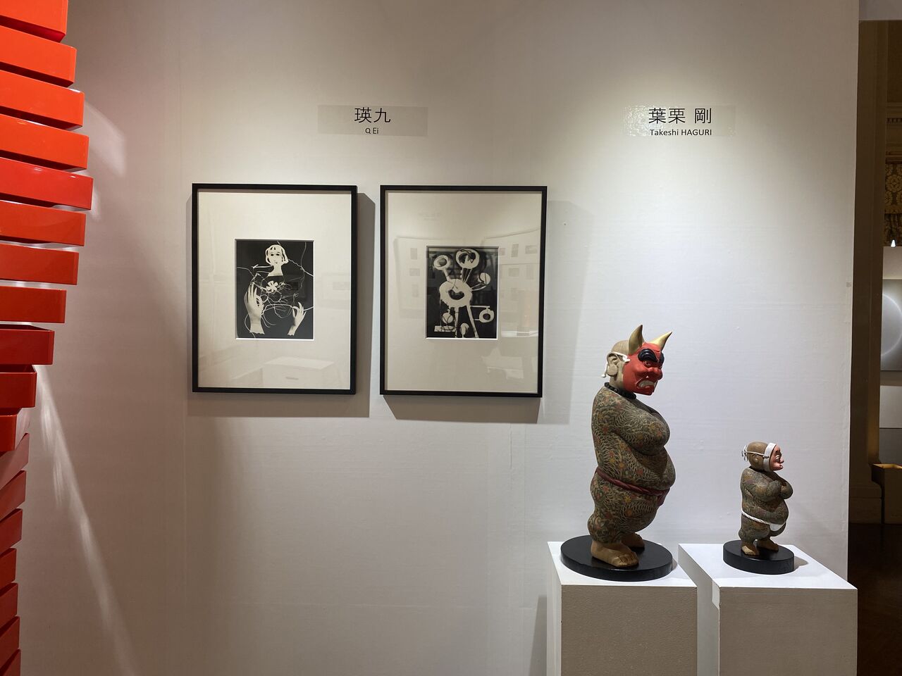 右の壁には、瑛九フォトデッサン、葉栗剛先生の木彫作品を2点展示。小さい方の作品が海外のお客様に売れました!やはり葉栗先生は海外の方に人気です。