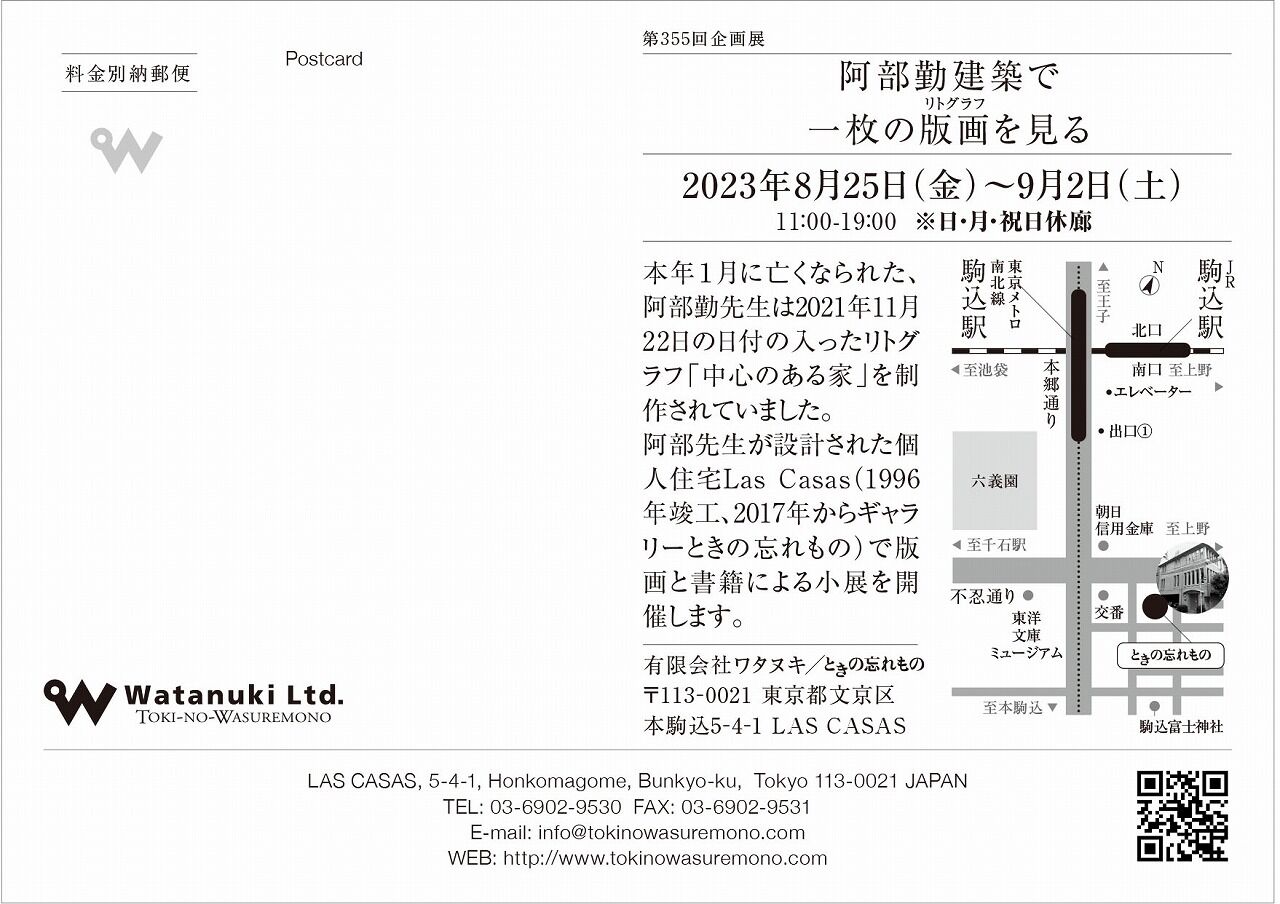 ときの忘れものは追悼の心をこめて、阿部先生が設計された個人住宅Las Casas(2017年からギャラリーときの忘れもの)で版画と書籍による小展を8月25日(金)~9月2日(土)に開催します。