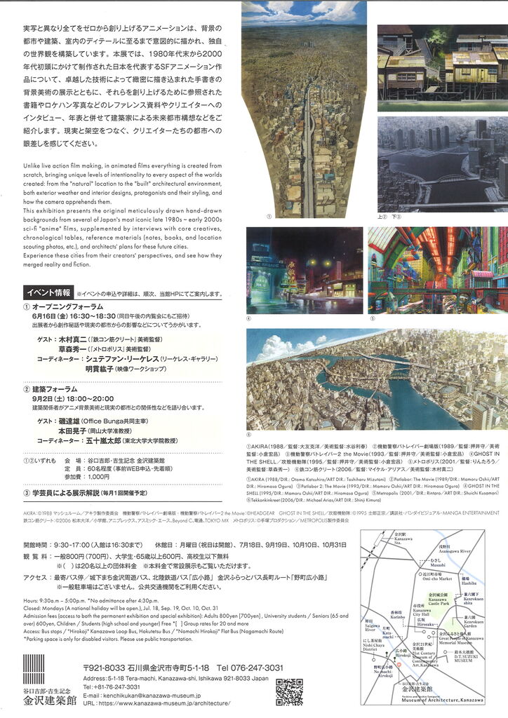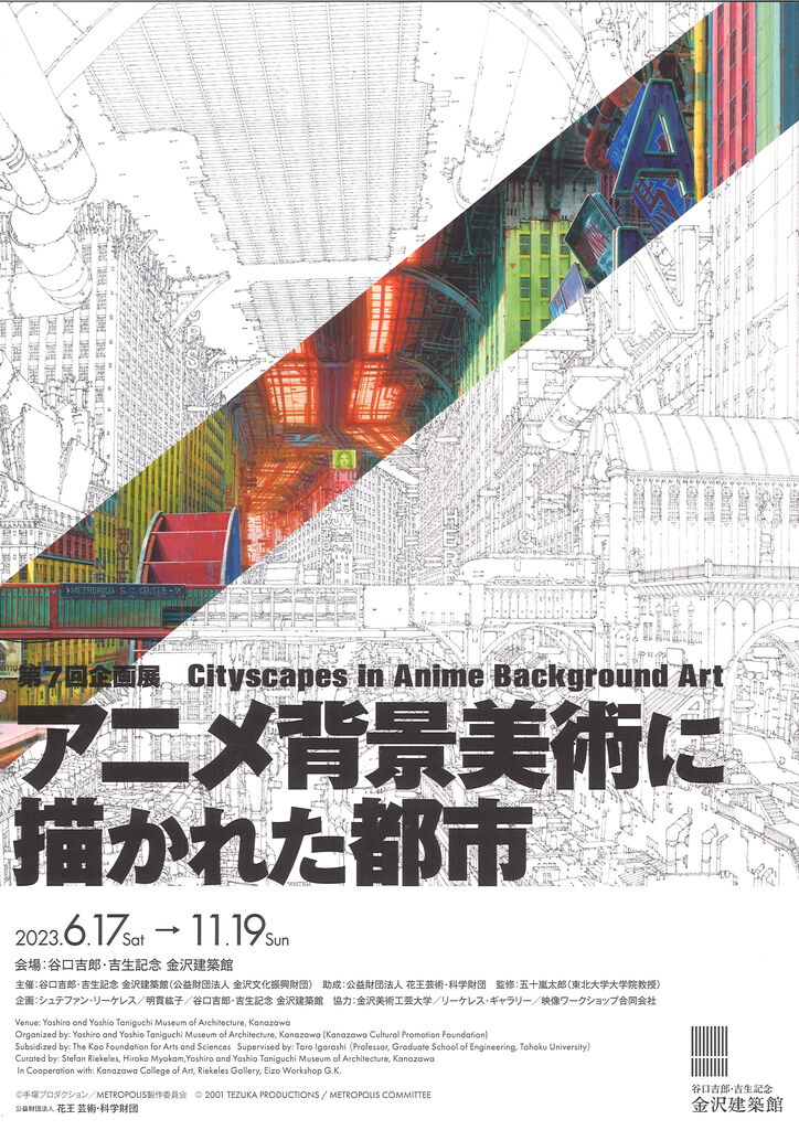 谷口吉郎・吉生記念金沢建築館では、初の異分野とのコラボレーション企画となる、第7回企画展「アニメ背景美術に描かれた都市」を開催中です。アニメ研究者のシュテファン・リーケレス氏(リーケレス・ギャラリー代表)とメディア芸術領域のアーカイブ研究者である明貫紘子氏(映像ワークショップ合同会社代表)によって実施された海外での展覧会をベースに、本展ではアニメーションにも造詣の深い建築評論家の五十嵐太郎氏(東北大学大学院教授)を監修に迎えて、都市の側面から企画構成を行いました。