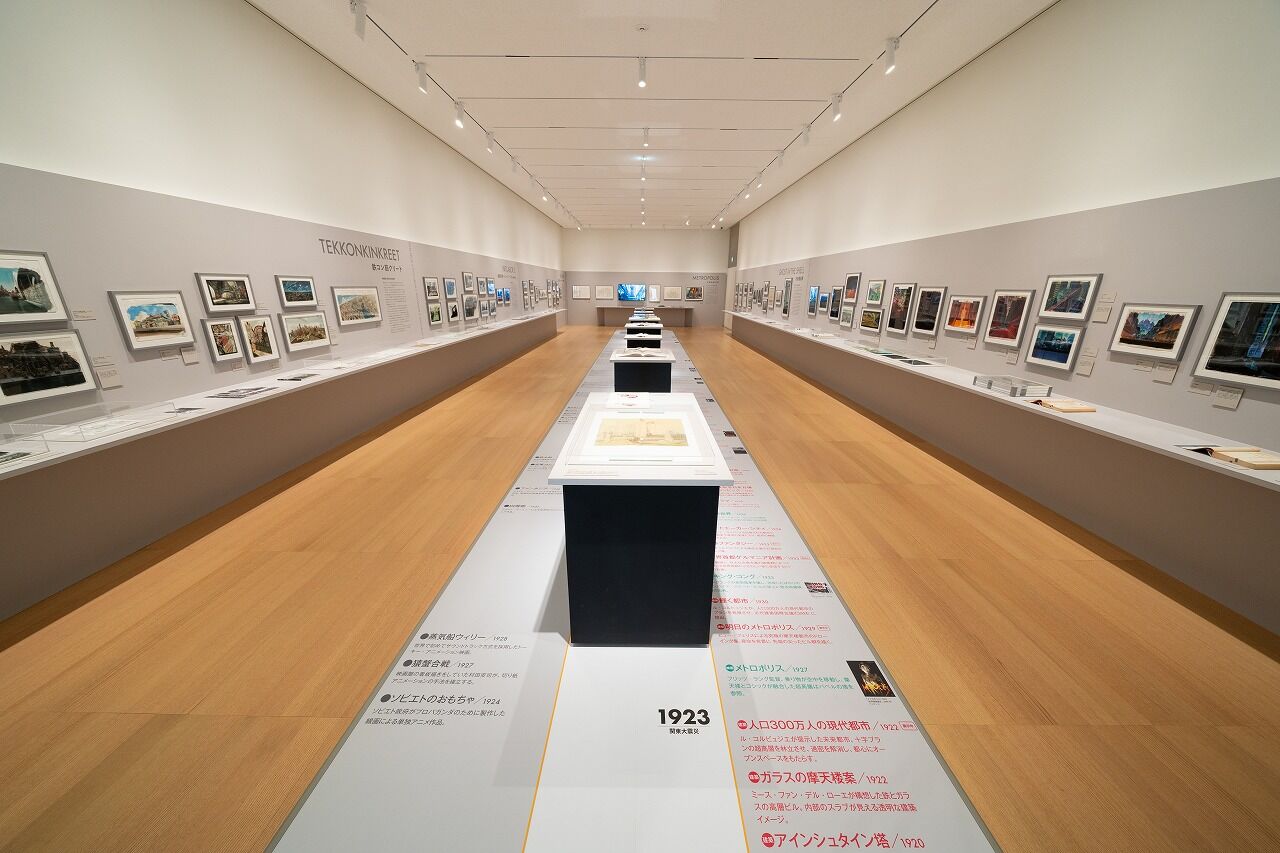 展示会場の中央には、本展用に制作したアニメ・映画・建築・漫画・ゲームに「描かれた都市」の年表と、建築家による未来都市構想を展示し、各作品の世界観を深掘りするための様々な視点を提示しています。