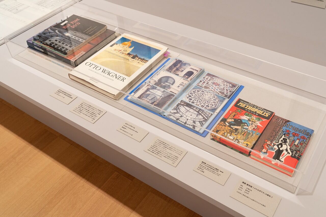 手塚治虫の原作漫画はアメリカの摩天楼がモデルと言われていますが、映画化に当たっては、絶対的権力の表現としてドイツやイタリアのファシズム建築が参考とされました。しかしディテールの少ないファシズム建築をアニメーションとして表現するのは難しく、美術監督の草森秀一氏は3年間試行錯誤されたそうです。その際に参考にされた大量の建築本の一部も借用し展示しています。