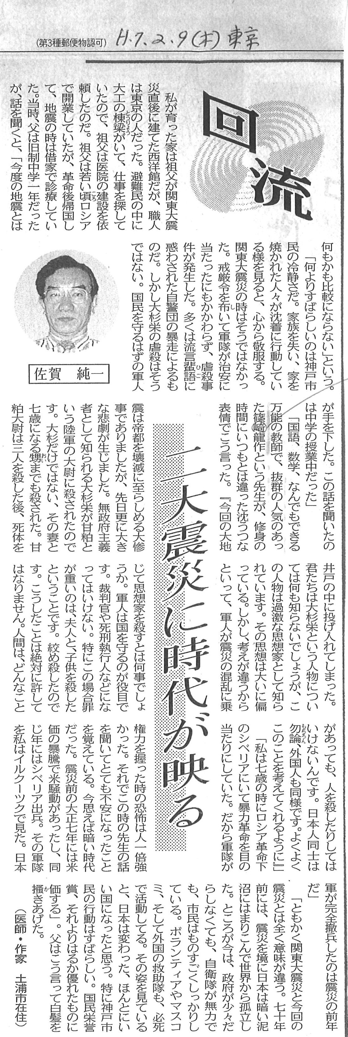 「何よりすばらしいのは神戸市民の冷静さだ。家族を失い、家を焼かれた人々が沈着に行動している様を見ると、心から敬服する。関東大震災のときはそうではなかった。戒厳令を布いて軍隊が治安に当たったにもかかわらず、虐殺事件が発生した。多くは流言蜚語に惑わされた自警団の暴走によるものだ。しかし大杉栄の虐殺はそうではない。国民を守るはずの軍人が手を下した。この話を聞いたのは中学の授業中だった」
